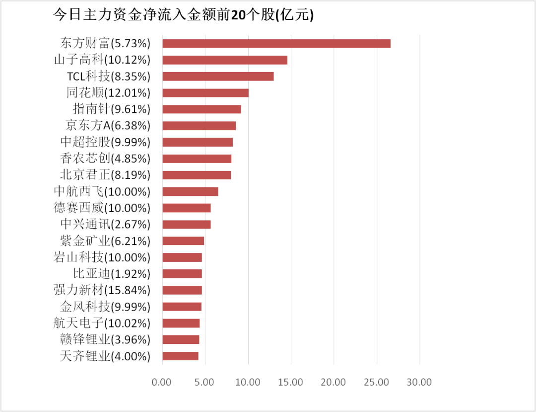 4.东方财富主力资金净流入26.58亿元居首