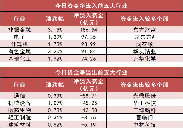 3. 非银金融行业净流入186.54亿元居首 申万一级行业中,22个行业实现资金净流入,其中非银金融行业净流入186.54亿元居首。