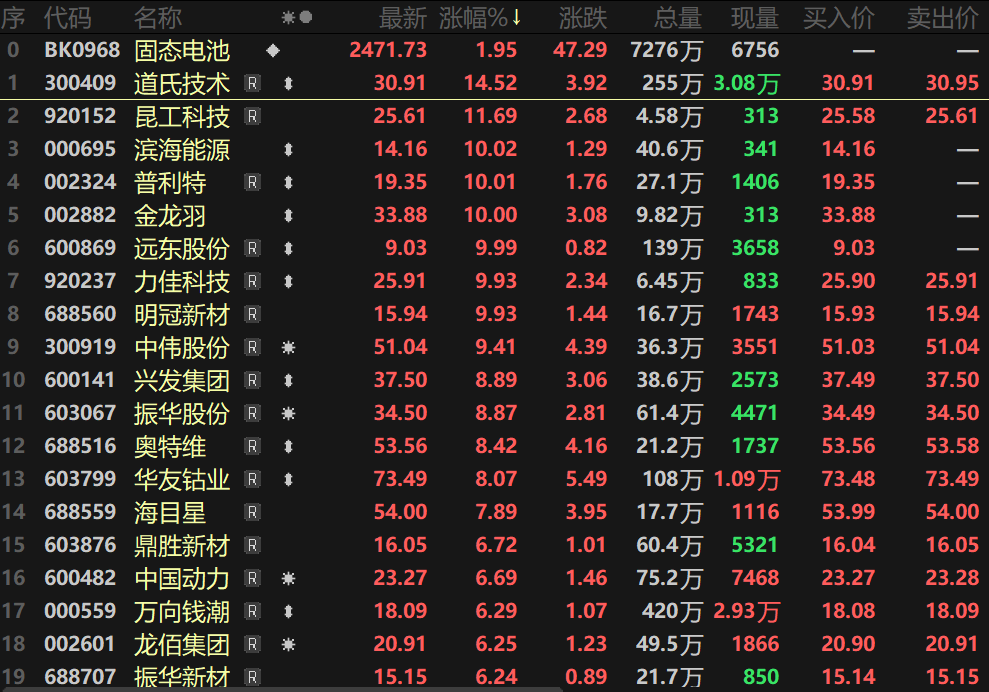 SMM 1月6日讯:2026年前两个交易日,固态电池板块持续活跃,今日指数盘中一度涨逾2%。个股方面,道氏技术、昆工科技等多股涨逾10%,滨海能源、普利特、金龙羽、远东股份等一同封死涨停板。