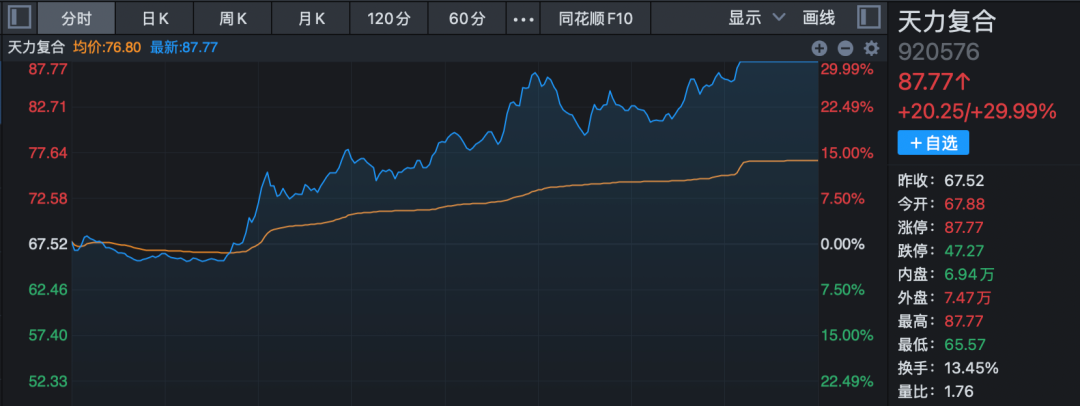 Wood Mackenzie预计,未来5年内,全球年均新增风电装机容量将超过170吉瓦,到2028年后将进一步提速,并在2034年达到峰值200吉瓦。 广发证券称,2026年风电板块站在“十五五”开局与国内外双景气共振的交汇点,配置逻辑围绕出海和产值结构性通胀。整机环节关注海外客户占比较高及积极推进海风部署的厂商。 航天装备概念股午后再度拉升,板块指数飙升8.55%,创历史新高。自去年12月以来,短短1个月时间该指数累计上涨超100%。天力复合临近收盘30%涨停,联建光电、航天环宇、航天电子、中国卫通等午后均强势涨停。