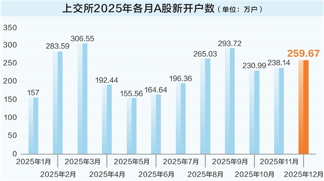 证券时报记者 胡华雄 上交所发布的新开户数据显示,2025年12月上交所A股新开户259.67万户,较前一个月的新开户数增长约9%,同比增幅为30.55%(2024年12月上交所A股新开户数为198.91万户)。 值得注意的是,2025年12月上交所259.67万户的A股新开户数为去年第四季度的月度最高值。 2025年,上交所A股月度新增开户数呈现显著的波浪形走势。具体来看,年初开户数自1月的157万户起步,于2月大幅跃升至283.59万户,并在3月突破300万户关口,形成第一个高峰。随后,受市场下跌影响,4月数据骤降至192.44万户,5月进一步回落至155.56万户的阶段性低点。 进入下半年,市场情绪逐步修复,开户数自6月至8月持续温和回升,并于9月攀升至293.72万户,达到下半年峰值及全年次高水平。10月因假期因素回调至230.99万户,此后11月微增至238.14万户,12月继续保持环比增长,为全年收官。 从2025年12月的具体情况来看,上交所个人新开A股账户为258.56万户,环比增长逾21万户;机构新开A股账户1.11万户,环比有小幅增长。另外,2025年12月上交所基金新开户24.41万户,环比增长逾7万户;上交所B股新开户0.05万户,环比基本持平。若将A股、B股、基金的新开户数加总,12月新开户数合计达284.13万户,同一统计口径下环比增长逾29万户。 整体来看,2025年全年上交所A股合计新开户数已达到2743.69万户,较2024年全年合计新开户数增长近一成。 2025年12月以及全年上交所A股新开户数的进一步增长,与A股市场行情的进一步上行密不可分。数据显示,2025年12月,A股市场主要指数多数实现上涨,其中创业板指涨势领先,其间累计上涨4.93%;深证成指表现亦较好,当月累计上涨4.17%;上证指数则累计上涨2.06%。 从2025年全年的情况来看,A股市场在2024年的基础上继续上行,上证指数2025年全年累计上涨18.41%,创出自2020年以来的最大年度涨幅,创业板指表现尤为亮眼,2025年累计上涨近五成。此外,2025年A股市场的年度成交额为历史上首次突破400万亿元,创出历史新高。 |
