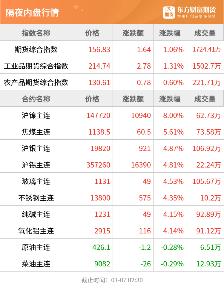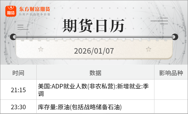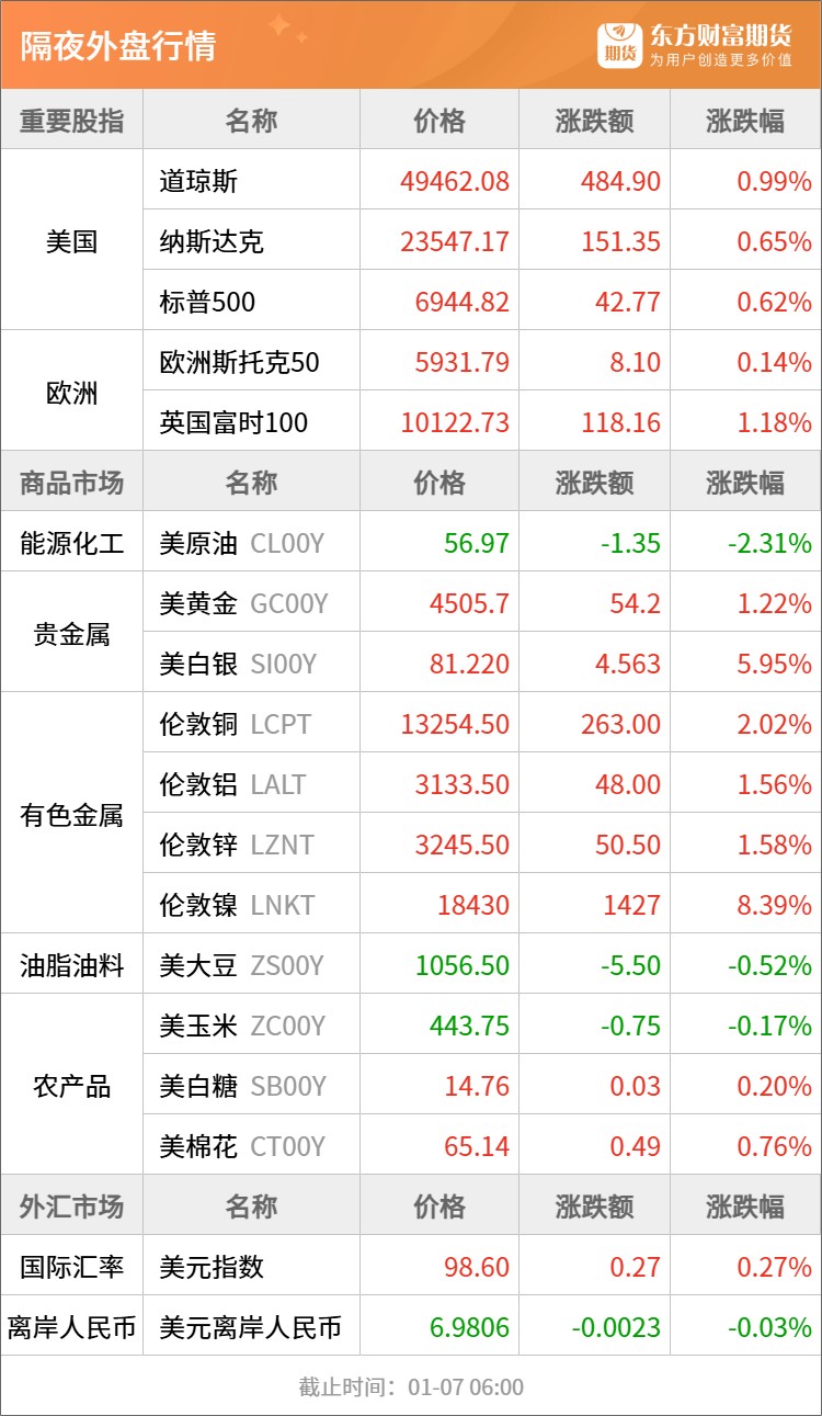 隔夜行情![]() ![]() 每日精选贵金属开年狂飙!白银涨超10%、现货黄金重上4490美元 后市怎么走? 深夜全线飙涨!美联储降息大消息!“应降息超100个基点” 新一轮找矿行动开启 有色金属牛市有望持续? 宏观产经央行网站:2026年中国人民银行工作会议1月5日-6日召开。会议强调,中国人民银行要以习近平新时代中国特色社会主义思想为指导,全面贯彻党的二十大和二十届历次全会精神,认真落实中央经济工作会议决策部署,坚持稳中求进工作总基调,继续实施适度宽松的货币政策,发挥增量政策和存量政策集成效应,加大逆周期和跨周期调节力度,提升金融服务实体经济高质量发展质效,深化金融改革和更高水平对外开放,增强宏观政策前瞻性针对性协同性,着力扩大内需、优化供给,防范化解风险、稳定社会预期,为经济稳定增长、高质量发展和金融市场稳定运行营造良好的货币金融环境,为实现“十五五”良好开局提供有力的金融支撑。 证券时报:为打通中长期资金入市卡点堵点,金融监管部门在持续倾听并搜集业界意见,以求更精准发力。近日,证券时报记者独家获悉,为做好“十五五”规划编制工作,监管部门上月调研了部分银行理财公司。其调研问题包括但不限于当前制约银行理财提高投资A股的规模和比例的障碍;行业未来五年对我国相关政策制度的期待;以及如何能提高理财投资A股的积极性等。 财联社:2026年全国外汇管理工作会议1月5日至6日在京召开。稳步推进外汇领域高水平制度型开放,助力多领域合作共赢。稳妥有序推进银行外汇展业改革,指导已改革银行向全国范围的分支行扩围,稳步推动更多银行启动改革,加强展业改革与便利化政策融合。出台境外放款、国内外汇贷款资金管理等政策,在全国实施跨国公司本外币跨境资金集中运营管理政策。 品种资讯黑色系期货 螺纹钢:1月6日,首钢长钢对建筑钢材价格调整如下:1、HRB400E材质螺纹钢价格暂稳,Φ20mm螺纹钢3110元;2、HPB300线材价格下调20元,Φ8-12mm高线3170元;3、HRB400E盘螺价格下调20元,Φ8-10mm盘螺3170元;以上价格均为现款含税。(西本新干线) 铁矿石:卫星数据显示,2025年12月29日-1月4日期间,澳大利亚、巴西七个主要港口铁矿石库存总量1158.3万吨,环比上升56.1万吨,呈小幅回升态势。目前库存量略低于第四季度以来的平均水平。(Mysteel) 煤炭:1月6日鄂尔多斯地区部分去年底因完成年度任务而暂停产销的煤矿陆续恢复正常生产,市场供应量逐步恢复正常水平。现终端补库需求小幅释放,产地情绪稍有好转,煤厂及贸易商采买操作积极性尚可,部分煤矿连续上调煤价,单次调价幅度为5-10元/吨不等。现Q5500坑口含税报500-560元/吨,Q5000坑口含税报390-440元/吨,Q4500坑口含税报330-370元/吨。(Mysteel) 农产品期货 棕榈油:南部半岛棕榈油压榨商协会(SPPOMA)数据显示,2026年1月1-5日马来西亚棕榈油单产环比上月同期减少34.7%,出油率环比上月同期增长0.04%,产量环比上月同期减少34.48%。(新华财经) 菜粕:截至2026年第1周,沿海油厂菜粕库存为0万吨,较上周不变;华东地区菜粕库存16.70万吨,较上周减少0.30万吨;华南地区菜粕库存为24.6万吨,较上周减少1.30万吨;华北地区菜粕库存为4.01万吨,较上周增加0.82万吨;全国主要地区菜粕库存总计45.31万吨,较上周减少0.78万吨。(Mysteel) 豆粕:截止到第1周末(1月3日),国内油厂平均开机率为52.25%,较上周的62.03%开机率下降9.78%。全国油厂大豆压榨总量为191.50万吨,较上周的227.35万吨下降了35.85万吨,其中国产大豆压榨量为1.08万吨,进口大豆压榨量为190.42万吨。(中国粮油商务网) 有色/贵金属期货 碳酸锂:优质碳酸锂市场价格区间在133500-134800元/吨,行情较上一个工作日上调8800元,电池级碳酸锂市场价格区间在132200-134800元/吨,行情较上一个工作日上调9150元,工业级碳酸锂市场价格区间在130000-131000元/吨,行情较上一个工作日上调9600元。(Mysteel) 1月6日,两家磷酸铁锂上市公司对上海证券报记者确认已成功提价。其中一位公司相关负责人表示,对大客户提价幅度1500至2000元/吨。(上海证券报) 多晶硅:2025年12月多晶硅国内企业产能开工率在39.69%,与11月相比下降2.6%,12月中国多晶硅产量11.3万吨,环比下降6.15%,同比上涨9.71%。预计2026年1月多晶硅排产10.45万吨,环比下降6.15%;2026年1月份多晶硅开工率在36.71%,环比下降3%。(Mysteel) 工业硅:中国12月工业硅产量为413797吨,环比增加0.87%。其中新疆产量为246808吨,环比增加5.65%。四川产量为15350吨,环比下降52.08%。云南产量为25335吨,环比下降21.49%。(Mysteel) 能化期货 PVC:杭州PVC市场盘面看涨气氛推动现货一口价上调,询单气氛一般,电石法五型在4600-4700元/吨,三联4580-4600元/吨,宜化/天湖/中泰/金泰4600-4650元/吨,北元/天业4650-4700元/吨左右,八/三型4720-4800元/吨左右。(隆众资讯) 成品油:自2025年12月22日国内成品油价格调整以来,国际市场油价小幅波动,按现行国内成品油价格机制测算,2026年1月6日的前10个工作日平均价格与2025年12月22日前10个工作日平均价格相比,调价金额每吨不足50元。根据《石油价格管理办法》第七条规定,本次汽、柴油价格不作调整,未调金额纳入下次调价时累加或冲抵。(国家发改委) 环球视野财联社:美联储理事米兰表示,预计后续经济数据将继续支持“降息是合适的”这一政策方向。美联储今年应降息超过100个基点。美联储政策显然是限制性的,阻碍了经济发展。还