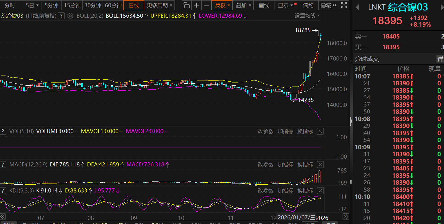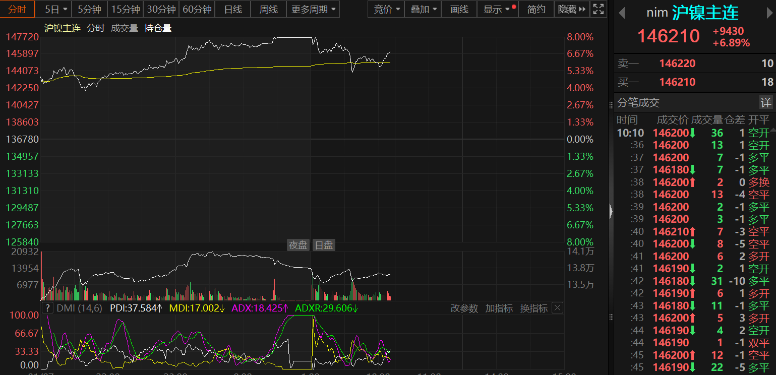 SMM 1月7日讯:2026年1月6日夜盘,沪镍多合约涨停,沪镍主力合约(2602)收涨至147720元/吨,以8%的涨幅封死涨停板;伦镍以8.39%的涨幅报18430美元/吨,盘中最高冲至18785美元/吨。1月7日日间开盘,沪镍及伦镍价格依旧不改其涨势,早间开盘继续强势上扬,截至10:14分左右,沪镍主连以6.89%的涨幅报146210元/吨,伦镍以8.19%的涨幅报18395美元/吨。