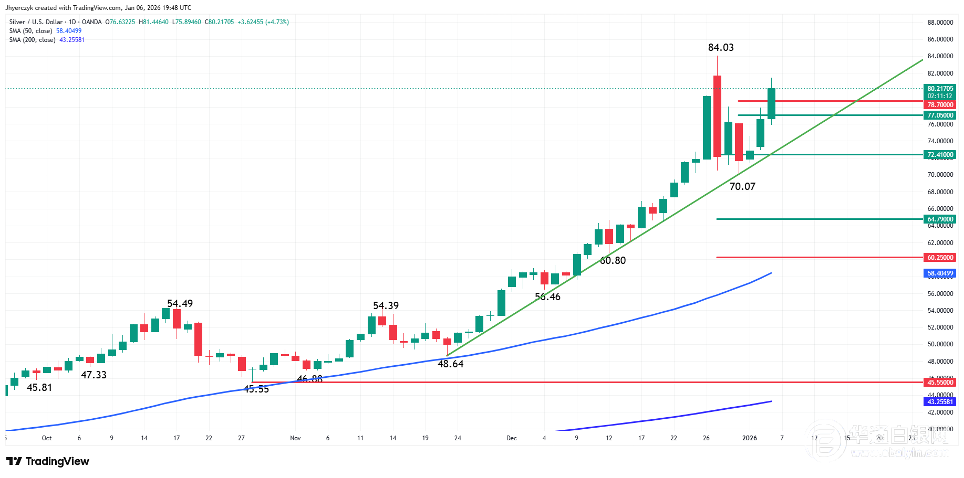 【华通白银网1月7日】•银价突破78.70美元阻力位,涨至81.45美元,距离记录高位84.03美元价格已近在咫尺。 •投资者放弃了“逢低买入”的策略,转而采取积极的“追涨”的模式,期待银价达到三位数水平。 •周五的非农就业报告将决定银价是大幅上涨还是暂停涨势,这取决于劳动力市场的强劲程度。 银价突破78.70美元阻力位,有望创下84.03美元新高