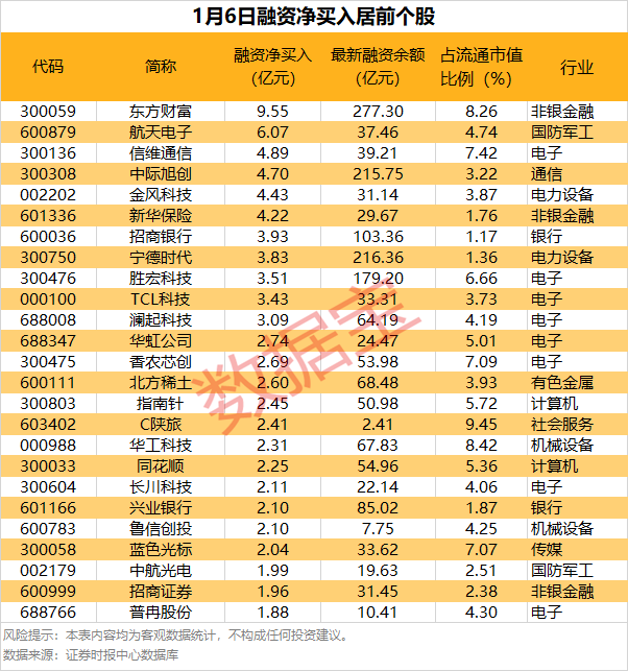 11股杠杆资金净买入超3亿元 截至1月6日,市场融资余额合计2.56万亿元,较前一交易日增加188.87亿元。 具体到个股,1月6日获融资净买入1亿元以上的有74股,其中11股融资净买入额均超3亿元。 东方财富融资净买入额居首,当日净买入9.55亿元;其次是航天电子、信维通信,融资净买入金额分别为6.07亿元、4.89亿元。 融资净买入金额居前的还有中际旭创、金风科技、新华保险等。 分行业统计,获融资客净买入超1亿元个股中,电子、有色金属、国防军工等行业最为集中,分别有22股、10股、10股上榜。