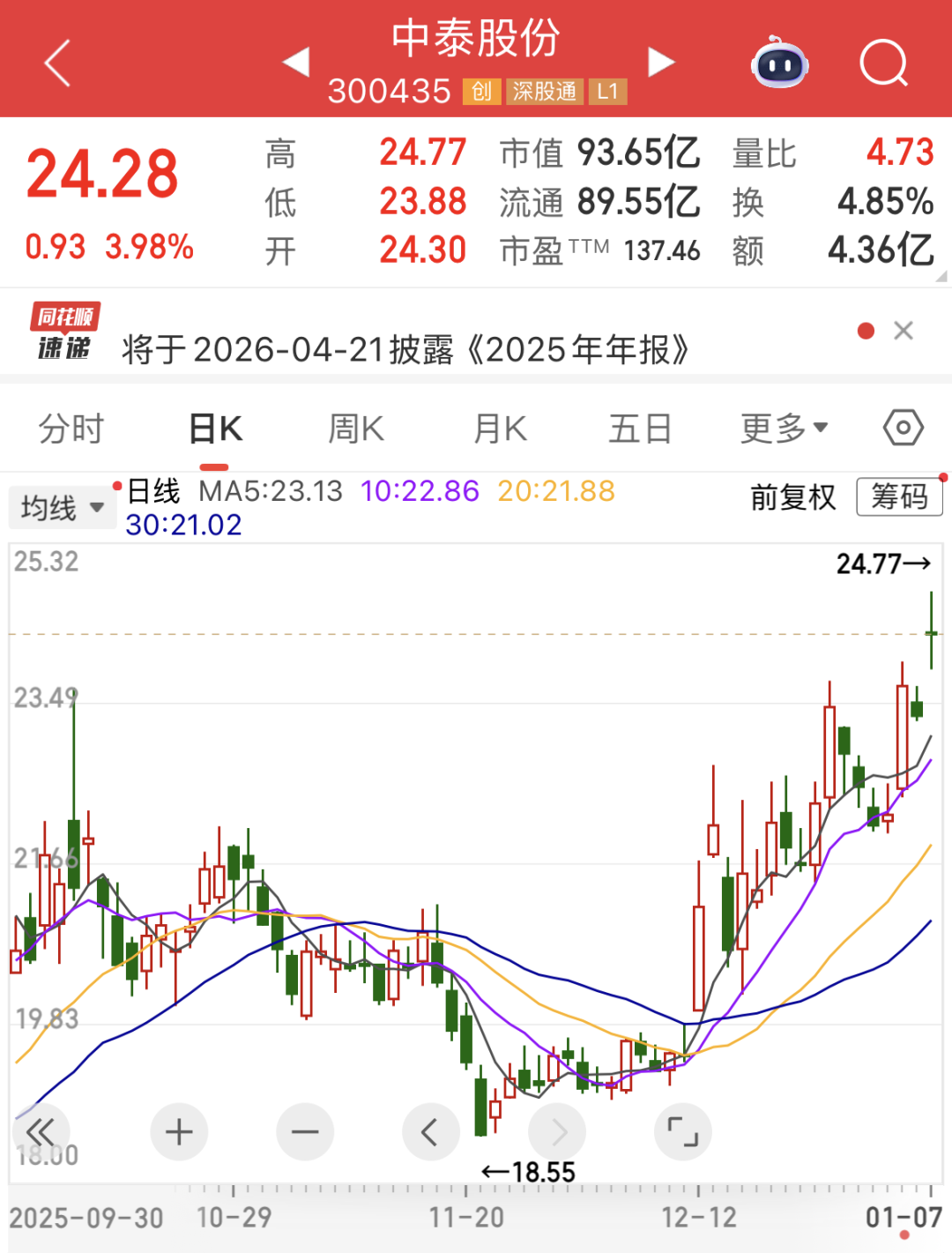 中泰股份预计2025年净利润为4.2亿元—4.8亿元,同比扭亏为盈,上年同期亏损7796万元。公司表示,由于公司制造板块2025年度海外订单进入发货周期,带动利润大幅增长。