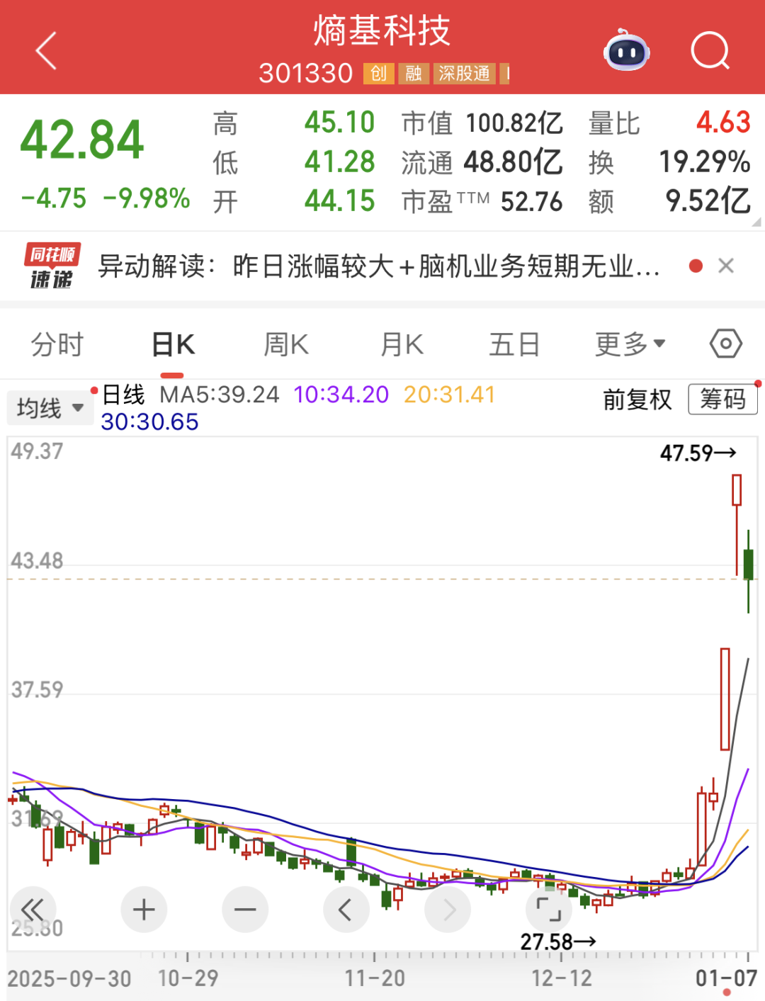 脑机接口热股获超百家机构调研 近两个交易日(1月5日至1月6日)共有32家公司公告机构调研记录。其中,5家公司获50家以上机构调研,熵基科技最受关注,有128家公司调研。 机构调研熵基科技主要关注公司脑机业务情况。公司表示,公司脑机业务继承公司在AI认知空间计算领域的长期积累,聚焦BioCVTinyML边缘模型研发,将空间理解、自主决策与脑电信号处理深度融合。通过将感知、分析与决策能力下沉至边缘设备,熵基科技持续优化“人、车、物、环境”多要素协同下的脑机交互表现,为非侵入式脑机接口的可穿戴化、场景化应用奠定了坚实技术底座。 从股价表现看,熵基科技连续2日“20cm”涨停后,今日股价大幅调整,早盘最高跌超13%。