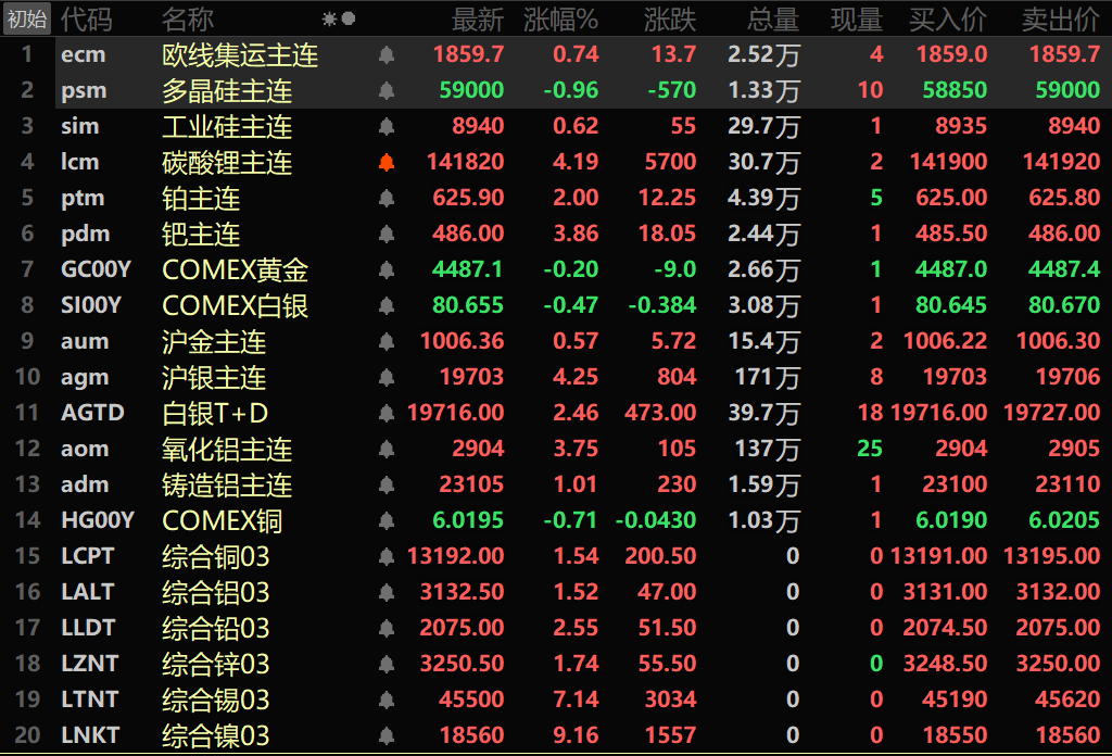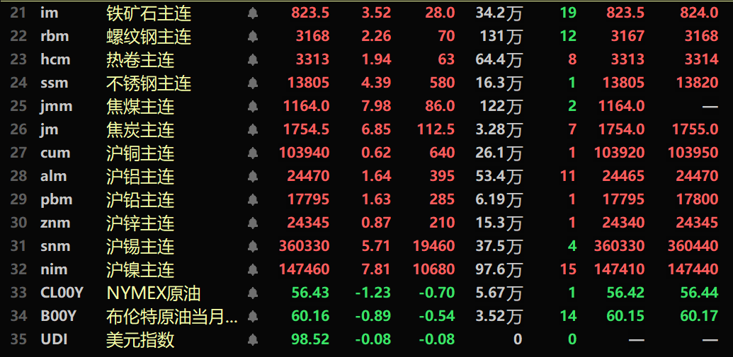 SMM1月7日讯: 金属市场方面: 截至午间收盘,内盘基本金属全线上涨,沪铜涨0.62%。沪铝涨1.64%。沪铅涨1.63%,沪锌涨0.87%。沪锡涨5.71%,沪镍涨7.81%。 此外,铸造铝主连期货涨1.01%,氧化铝主连涨3.75%。碳酸锂主连涨4.19%。工业硅主连涨0.62%。多晶硅主连跌0.96%。 黑色系均飘红,铁矿涨3.52%,螺纹涨2.26%,热卷涨1.94%,不锈钢涨4.39%。双焦方面:焦煤主力合约以7.98%的涨幅涨停,焦炭主力合约涨6.85%。 外盘基本金属方面,截至11:42分,LME金属全线上涨。伦铜涨1.54%,伦铝涨1.52%。伦铅涨2.55%。伦锌涨1.74%。伦锡涨7.14%。伦镍涨9.16%。 贵金属方面,截至11:42分,COMEX黄金跌0.2%;COMEX白银跌0.47%。内盘贵金属方面:沪金主连涨0.57%,沪银主连涨4.25%,盘中刷新历史新高至20235元/千克。 此外,截至午间收盘,铂主连期货涨2%,钯主连期货涨3.36%。 截至午间收盘,欧线集运主力合约涨0.74%,报1859.7点。 截至1月5日11:42分,部分期货午间行情: