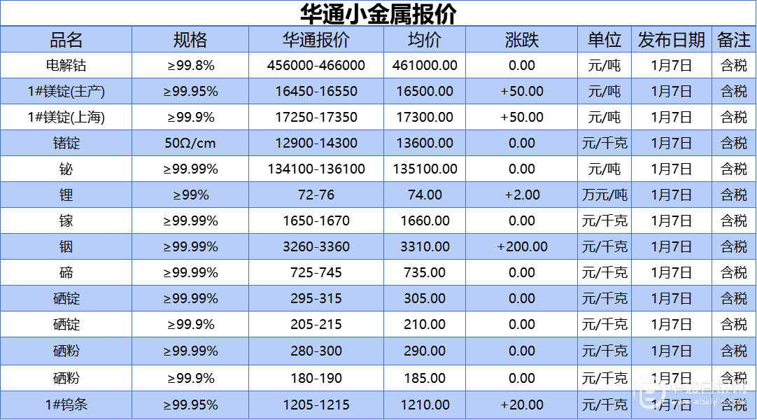 华通白银网 1月7日讯:电解钴、1#镁锭(生产)、1#镁锭(上海)、锗锭、铋、锂、镓、铟、碲、硒锭(99.99%)、硒锭(99.9%)、硒粉、硒粉(99.9%)、1#钨条报价