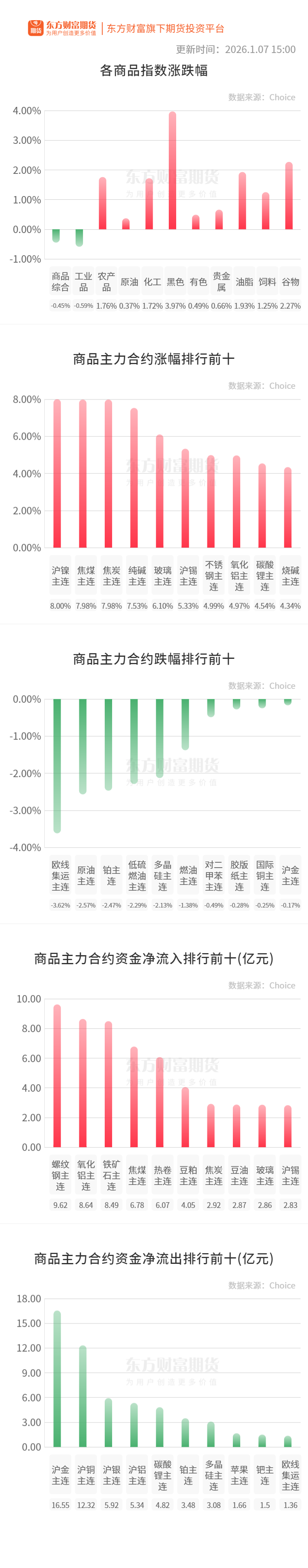 行情纵览![]() 宏观要闻财联社:1月7日,中国物流与采购联合会发布2025年12月份全球制造业采购经理指数,指数较上月微幅下降,全球经济基本平稳。2025年12月份全球制造业采购经理指数为49.5%,较上月微幅下降0.1个百分点,连续10个月运行在49%~50%的区间内。分区域看:亚洲制造业采购经理指数较上月上升,升至51%以上;欧洲制造业采购经理指数较上月下降,仍在50%以下;非洲制造业采购经理指数较上月上升,升至50%以上;美洲制造业采购经理指数较上月下降,降至48%以下。 中国人民银行:央行今日开展286亿元7天逆回购操作,投标量286亿元,中标量286亿元,操作利率为1.40%,与此前持平。 品种资讯黑色系期货 钢材:截止1月7日当周,据找钢网数据显示,全国重点钢材品种产量、库存如下:全国建材数据产量445.32万吨,较上周减少4.96万吨;厂库395.1万吨,较上周增加16.05万吨;社库343.99万吨,较上周减少6.06万吨;总库存739.09万吨,较上周增加15.39万吨;表需429.93万吨,较上周减少37.54万吨。(找钢网) 1月7日,首钢长钢对建筑钢材价格调整如下:HRB400E材质螺纹钢价格上调30元,Φ20mm螺纹钢3140元;HPB300线材价格上调30元,Φ8-12mm高线3200元;HRB400E盘螺价格上调30元,Φ8-10mm盘螺3200元;以上价格均为现款含税。(西本新干线) 煤炭:7日陕西地区多数煤矿正常生产销售,煤炭供应基本稳定。近期区域内煤矿陆续复产,叠加全国多地降温,市场供需均有所提升,多数在产煤矿维持产销平衡,库存水平中低位。价格方面,高卡面煤、籽煤价格有探涨趋势,幅度5-10元/吨。当前全国多地降温,居民用电负荷有所提升,矿方情绪稍有改善,贸易商对煤价上行仍存期待,后续还需继续关注港口库存变化情况及下游实际补库需求。(Mysteel) 农产品期货 生猪:截至1月7日14:00时,全国农产品批发市场猪肉平均价格为17.95元/公斤,比昨天下降0.2%。(农业农村部) 鸡蛋:今日主产区山东鸡蛋均价6.51元/公斤,较昨日价格上涨0.21;河北鸡蛋均价6.07元/公斤,较昨日价格上涨0.18;广东鸡蛋均价7.07元/公斤,较昨日价格上涨0.20;北京鸡蛋均价6.50元/公斤,较昨日价格上涨0.20。(中国饲料行业信息网) 有色/贵金属期货 碳酸锂:电池级碳酸锂指数价格132231元/吨,环比上一工作日上涨6226元/吨;电池级碳酸锂12.8-13.9万元/吨,均价13.35万元/吨,环比上一工作日上涨6000元/吨;工业级碳酸锂12.6-13.4万元/吨,均价13万元/吨,环比上一工作日上涨5750元/吨。(SMM) 记者从多个信源获悉,今日多部门联合召开动力和储能电池行业座谈会,有参会企业方透露,会议主要内容还是围绕行业“反内卷”,包括控产能、管价格战、保护专利等相关内容。(财联社) 黄金:今日国内黄金饰品价格对比显示,多家品牌公布的境内足金首饰价格持续上行,其中老庙黄金足金饰品报1402元/克,较昨日上涨13元/克;老凤祥足金饰品报1399元/克,周大福足金首饰报1398元/克。(财联社) 多晶硅:据Mysteel数据显示,2025年12月中国多晶硅企业产量11.3万吨,环比11月下降6.15%,同比2024年12月上涨9.71%。12月多晶硅产量继续下行,头部企业产出下降明显,部分企业虽有增量,但体量有限,总量环比持续下降。据Mysteel预计,2026年1月份多晶硅排产10.45万吨,环比下降6.15%。2025年12月多晶硅国内企业产能利用率在39.69%,与11月相比下降2.6%。(Mysteel) 沪铜:花旗表示,在强劲动能的推动下,铜价将在未来三个月升至每吨14000美元,但若无新的催化因素,铜价本月就可能见顶。(财联社) Mysteel调研国内58家电解铜生产企业,涉及精炼产能1648万吨(含2025年新增产能)样本覆盖率98.93%得出: 2025年12月国内电解铜实际产量115.53万吨,环比增加1.3%,同比增加11.26%。1-12月国内电解铜产量累计为1356.15万吨,同比增加14.5%。 Mysteel调研国内60家电解铜生产企业,涉及精炼产能1683万吨(含2026年新增产能)样本覆盖率99.41%得出:另据调研企业的生产计划安排来看,2026年1月国内电解铜预计产量117.69万吨,环比增加1.87%,同比增加11.26%。(Mysteel) 能化期货 原油:当地时间1月6日,美国总统特朗普宣布,委内瑞拉临时政府将向美国移交3000万至5000万桶石油。这些石油将按市场价格出售,而所得资金将由特朗普进行监管,以确保这些资金用于“造福委内瑞拉人民和美国人民”。(央视新闻客户端) 尿素:山东地区尿素行情继续小涨,小颗粒主流出厂成交1710-1750元/吨,大颗粒出厂参考1900元/吨。临沂市场一手贸易商出货参考价格1750-1760元/吨附近,菏泽市场参考价格1740-1750元/吨附近。(隆众资讯) 甲醇:截至2026年1月7日,中国甲醇港口库存总量在153.72万吨,较上一期数据增加4.08吨。其中,华东地区累库,库存增加5.72万吨;华南地区去库,库存减少1.64万吨。本周甲醇港口库存继续积累,主要积累在浙江地区,周期内显性外轮卸货22.71万吨。(隆众资讯) 晚间关注21:15 美国:ADP就业人数(非农私营):新增就业:季调 23:30 库存量:原油(包括战略储备石油) (文章来源:东方财富研究中心) |