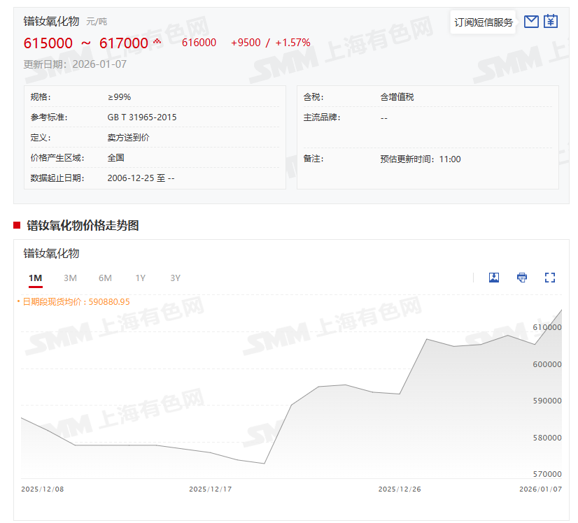 》点击查看SMM稀土现货价格 》订购查看SMM金属现货历史价格走势 现货市场方面,1月7日,从稀土精矿、稀土氧化物、稀土金属到钕铁硼毛坯等稀土产业链的价格整体出现上涨。具体来看:氧化镨钕的价格为615000~617000元/吨,其均价报616000元/吨,较前一交易日涨1.57%;镨钕金属的价格为740000~755000元/吨,其均价为747500元/吨,较前一交易日涨1.7%;钕铁硼毛坯50SH的价格为337~357 元/千克,其均价为347元/千克,较前一交易日涨0.58%。 据SMM了解,受政策面消息的带动,市场对后市需求的乐观预期升温,叠加部分大厂的进场采购,以及目前分离厂尚未完全复产,其产能的恢复尚需时日,短期供应偏紧的局面尚未改变以及市场情绪的乐观带动稀土产业链的价格均出现上涨。不过行情热度与实际成交存在一定分化:尽管市场询盘活跃度明显提升,但下游金属加工企业及磁材厂的订单需求暂未出现实质性放量,因此当前市场实际成交情况并未同步改善。 对于稀土的后市,市场看涨情绪较浓将使得上游不愿低价出货,而下游订单尚未出现大幅改变,而且部分磁材厂由于订单不理想考虑提前放假等也将使得其在采购高价货源时将更加谨慎,预计未来稀土上下游博弈将愈发激烈,而短期稀土价格也将继续呈现高位震荡的趋势。后续需重点关注分离厂产能全面恢复的节点,若供应端支撑力度随产能释放而减弱,这将使得稀土价格承压回落。 机构声音 湘财证券指出,元旦后稀土供应端逐步恢复,但市场流通的氧化物仍偏紧,叠加春节前存在备货需求,下游刚需尚可,预计短期内稀土价格将维持弱稳态势。同时,政策约束下供给难有明显增量,产业链价格韧性较强,板块行情有望企稳回升。轻稀土价格持续上升,其中氧化镨钕均价周内上涨5.84%,金属镨钕跟涨,成本支撑下钕铁硼毛坯价格也小幅上行。 日本野村综合研究所的评估显示,日本用于电动汽车驱动电机钕磁体的镝、铽等重稀土几乎100%依赖中国供应,一旦受限,日本经济将面临较大冲击。野村综合研究所估算,假设中国对日稀土出口限制持续3个月,其结果是造成6600亿日元左右的损失,促使年名义和实际GDP下降0.11%。如果持续一年,损失额将达2.6万亿日元左右,年名义和实际GDP将减少0.43%。(财联社) 华西证券研报显示:全球稀土资源高度集中,且中国稀土产储均位于全球第一。2025年11月7日,商务部与海关总署联合公告,宣布自即日起至2026年11月10日,暂停实施涉及超硬材料、稀土相关物项、锂电池及人造石墨负极材料的6项出口管制措施,中美关系有所缓和。美国政府积极重建本国稀土产业链,其中美国磁铁制造商eVAC近日从其南卡罗来纳州Sumter工厂运送了首批钕铁硼永磁体,但短期看全球稀土永磁体生产仍高度集中于中国,且考虑到海外产能释放仍需时间且我国新增产能规模,我国仍是全球唯一具备稀土全产业链各类产品生产能力的国家,且美西方稀土产业链的整体规模远低于我国,其产业链均不完整并存在明显短板。且8月22日发布的《稀土开采和稀土冶炼分离总量调控管理暂行办法》或引发市场对供给侧收紧的预期。后续需等待我国政策的进一步指引。 中信证券认为,供需格局或持续向好,稀土板块业绩或持续上行。新能源汽车、风电、节能电机等产业顺应低碳环保的政策趋势,人形机器人或将成为新增长极,预计2027年全球钕铁硼需求有望增至32.9万吨,对应2024—2027年CAGR为13%。中信证券测算,2024年钕铁硼行业CR4约为29%,随着头部公司扩产落地,预计2026年钕铁硼行业CR4有望升至42%。传统需求旺季即将到来,供需格局或持续向好,稀土价格有望稳中有进,预计今年三、四季度稀土产业链业绩或逐季提升,建议持续关注稀土产业链战略配置价值。 推荐阅读: 》看涨情绪再度升温 稀土价格全线上涨【SMM稀土日评】 |