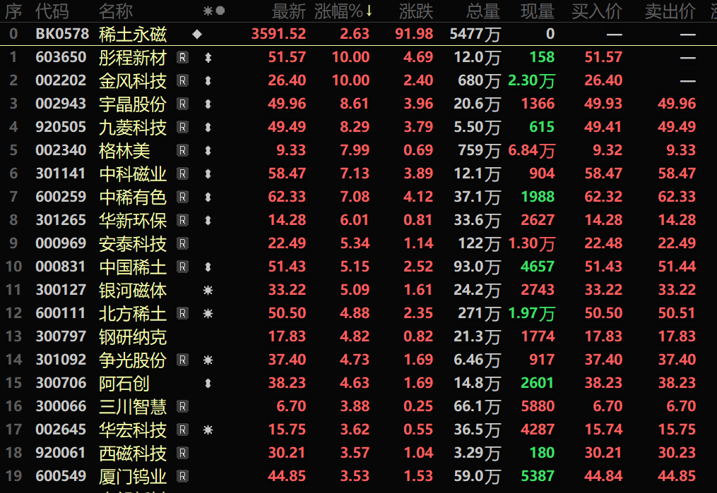 SMM1月7日讯: 商务部1月6日发布关于加强两用物项对日本出口管制的公告。政策催化下市场对中长期需求的乐观预期进一步抬升。而元旦后分离厂陆续进行复产,产能尚未完全恢复叠加进入流通环节均需要一段时间,稀土供应偏紧局面仍存叠加市场看涨情绪浓厚,上游挺价惜售,带动稀土产业链价格出现全线上涨。与稀土现货价格的普涨相呼应,稀土永磁概念股也在资本市场有亮眼的表现。截至1月7日收盘,稀土永磁概念板块涨2.63%。个股方面:彤程新材、金风科技涨停,宇晶股份、九菱科技、格林美、中科磁业、中稀有色、华新环保、中国稀土、银河磁体以及北方稀土等涨幅居前。