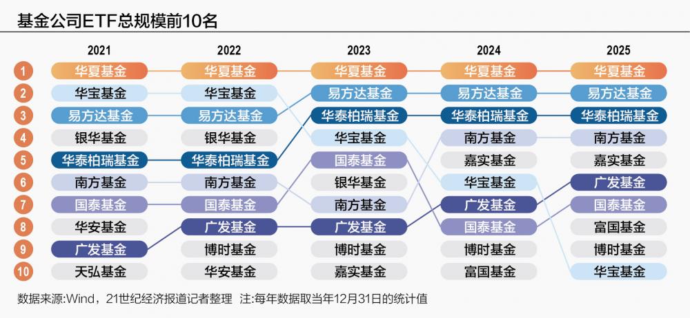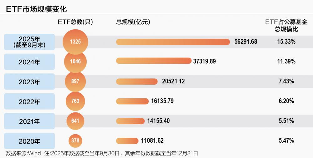 2025年12月26日,ETF总规模正式突破6万亿元大关,达到6.03万亿元。当年年内,ETF规模总共增加2.29万亿元,同比增长突破60%,市场规模与吸引力迈上新台阶。 这一跨越并非一蹴而就,而是中国ETF市场从“缓步积累”走向“跨越增长”的生动写照。 自2004年首只ETF上市,到2020年10月ETF市场规模突破1万亿元,ETF市场“从0到1”的过程历时近16年。但2021年以来,ETF的加速跑逐渐启动,其从1万亿元到2万亿元的跨越用时已缩短到3年时间——在2023年底,ETF市场规模达到2.05万亿元。 2024年起,ETF市场迈入爆发式增长阶段,全年规模增长1.68万亿元。2025年8月,ETF市场规模突破5万亿元,又在12月即站上6万亿元关口,仅耗时4个月,创下了万亿元整数关口的最快跨越纪录。 过去五年,全市场ETF总规模从1.1万亿元一路增长至6.02万亿元,累计增幅高达452.53%。 与规模增长相辅相成地,ETF市场其他的一些发展数据,同样画出了清晰的“加速曲线”。Wind数据显示,2020年末至2025年末,全市场ETF份额从约7260亿份跃升至3.37万亿份,增长367.61%;产品数量也从五年前的326只增至1402只,五年间新发1076只;总成交额更从843.48亿元攀升至3960.20亿元,增幅369.51%。 远超行业平均的增速,也让ETF在公募市场中的地位水涨船高。 数据显示,在2020年末,ETF还是占公募基金总规模比重仅5.47%的“小角色”,但在2025年三季度末,这一数字已增至15.33%,几乎翻了两倍。在公募总规模稳步增长的进程中,ETF以显著的增速“超车”向前,意味着其不仅是跟随行业发展大势,更是在凭借自身的优势,成为资产配置工具中日益重要的一极。 管理人竞逐:龙头位次逐渐定型,前10名入场门槛“狂飙”