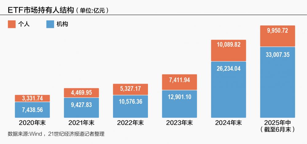 从2020年年末至2025年年中,中国ETF市场的持有人结构,最核心的特征是机构投资者主导地位的巩固。 纵观近五年的数据,机构投资者持有ETF的总占比从2020年年末的69.07%显著上升至2025年年中的76.84%,增幅近8个百分点,其持有净值的绝对规模更是从7438亿元增长至3.3万亿元,扩张超过四倍。 “专业投手”偏爱什么?Wind数据显示,股票型ETF无疑是机构布局的绝对方向。更具体的数据显示,其机构持有占比从2020年年末的62.64%大幅提升至2025年年中的77.43%,其中沪深300、中证500等宽基指数ETF是承接机构资金入市的核心工具。 2024年以来,政策环境的持续优化,让机构投资者在ETF持仓总规模和占比上尤其出现了一波跨越式增长:中长期资金入市指导意见的出台与ETF费率在年内的下调,有效疏通了社保、保险、理财等“活水”入市的渠道,为市场注入了长期稳定的力量。 在固收领域,机构投资者对ETF更是偏爱。过去五年来,债券型ETF的平均机构投资者占比始终高于90%,货币型ETF也长期维持在70%以上。这些产品本质上是机构的“现金管理工具箱”和“资产压舱石”,凸显了其投资组合中追求稳健与流动性的特征。 与机构配置形成对比的是,个人投资者对ETF的选择更具有灵活性与交易性。以权益类ETF为例,过去五年,在行业指数ETF中,个人投资者展现了更持续的高参与度,其持有ETF净值占比长期与机构投资者分庭抗礼,至2025年年中仍保持在47.97%。在主题指数ETF中,个人投资者的占比也长期维持在46%以上。 国家队持有:从藉藉无名到成为重要稳市工具 过去五年,在“国家队”资金几次的救市动作中,日益成熟的ETF市场,也正在成为稳定信心、引导预期愈发重要的工具。 中央汇金对ETF的买入,最早可以追溯到2013年。当年6月,中央汇金首次持有ETF,在沪深300ETF、上证180ETF和上证50ETF的持有人名单中首次现身,当年年中的持有总规模共147亿元。在2015年极端行情中,中央汇金对宽基指数的配置比例更加均衡,除上述三大指数外,中证500ETF、上证180金融ETF和深证100ETF也获得了国家队持有。 此后8年来,中央汇金在市场上一直动作不多。不过直到2023年,当国家队再次出手稳市时,ETF的工具地位开始越发凸显,在当年年末,汇金系持有ETF的总规模为1176.95亿元。 2024年起,中央汇金明显加大了对ETF的配置力度与范围,截至2024年年中,其持仓规模已迅速攀升至5905亿元,到年底更突破万亿,达10531亿元。其持仓范围也进一步扩大,开始涵盖中证1000ETF、创业板ETF、科创板ETF等。 2025年4月,面对市场短期剧烈震荡,中央汇金首次明确其“类平准基金”的定位,并通过ETF大举提供资金流动性支持。至2025年上半年末,其持有的ETF规模进一步增至12899亿元,较2023年年底增长超过九倍。 据统计,截至2025年年中,“汇金系”公司已出现在15只ETF的前十大持有人中,对其中12只的持仓比例均超过20%,既涵盖沪深300、上证50等蓝筹风格产品,也布局中证1000、创业板、科创板等成长板块。同时,通过旗下与公募管理人的相关资管计划,国家队的ETF布局也开始延伸至软件、医疗器械、5G通信、中概互联等细分行业ETF之中。 2025年三季报显示,国家队对前述重点ETF的持仓份额均保持了稳定。而可以确定的是,在下一程,ETF无疑还将在中国资本市场的生态中扮演更重要的角色。 |