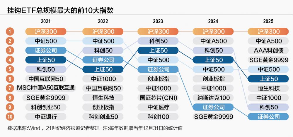 哪些指数是被动投资界的“顶流”?纵观过去五年,ETF市场呈现出“核心宽基指数地位稳固,细分赛道与创新主题轮动活跃”的显著特征,反映了投资者结构、市场热点和政策导向的深刻变化。 其中,沪深300指数毫不意外地稳坐“C位”,截至2025年年末挂钩ETF的规模体量已达到11855.57亿元,且过去五年始终蝉联规模榜首,凸显出其作为A股市场基准和核心资产配置工具难以撼动的地位。中证500与上证50指数的ETF规模也长期稳居前列。 不过在宽基之间,“新陈代谢”也在悄然发生。2024年,作为新“国九条”后首只重磅宽基指数,中证A500凭借其刻画优质资产的新定位,甫一落地便受到机构对挂钩ETF的踊跃申报以及投资者的积极认购,当年年末即跃居ETF产品规模总榜第二。截至2025年年末,A500的挂钩ETF规模进一步突破3000亿元,显示出ETF市场对“向新向优”表征工具的追逐。 5~10名左右位次的争夺,则更直观地映照出市场投资风格的轮动。一度高居第二的“证券公司”指数热度自2021年以来逐渐消退,至2025年年末已滑落至第十名,同属金融板块的“中证银行”也只是在五年前短暂亮相。 相比之下,以双创板块为代表的科技创新、成长类指数在五年来强势崛起,聚焦中小盘的中证1000指数也日益走到聚光灯下。2024年,纳斯达克100指数在过去五年首度跻身前十,背后是美股市场的亮眼表现与ETF布局海外优质资产的便利性共同催化的结果。 在2025年,指数前十榜单呈现出此前未有的资产多元化图景。投资者的配置与避险需求,推动了更多大类资产“破圈”:科创债指数的ETF一举冲至规模第三,黄金指数的ETF规模排名也升至五年来的最高位次。当投资者的偏好在经济周期和行业轮动的动态变化下不断迁徙,ETF也正从单纯的市场跟踪工具,逐渐演变为承载多元投资策略和资产配置理念的重要载体。 持有人格局:机构主力地位巩固,中长期资金入市显成效