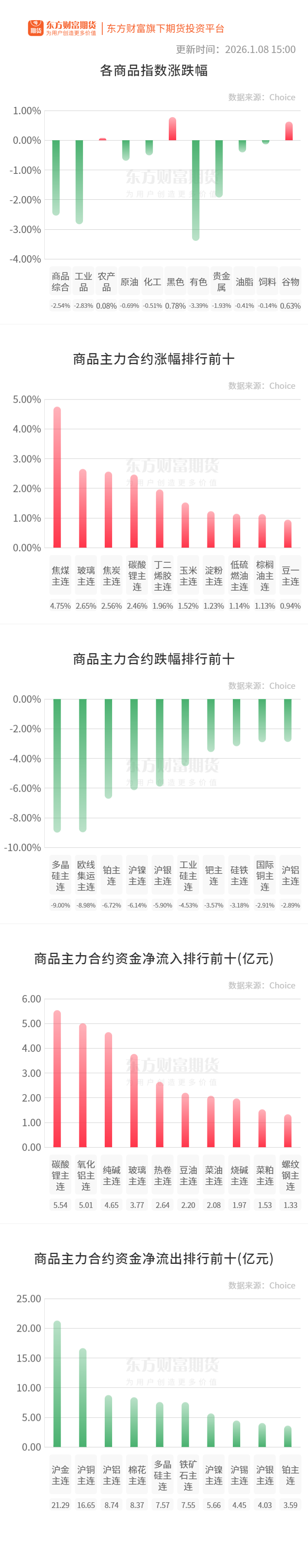 行情纵览![]() 宏观要闻新华社:商务部8日举行例行新闻发布会,商务部新闻发言人何亚东在回应有关委内瑞拉的提问时说,美方的霸权行径,严重违反国际法,侵犯委内瑞拉主权,威胁拉美地区和平与安全,中方对此坚决反对。中委经贸合作是主权国家之间的合作,受到国际法和两国法律的保护,其他国家无权干涉。无论委政局如何变化,中方持续深化两国经贸关系的意愿不会改变。 财联社:央行今日开展99亿元7天逆回购操作,投标量99亿元,中标量99亿元,操作利率为1.40%,与此前持平。 品种资讯黑色系期货 螺纹钢:截至1月8日当周,螺纹钢产量连续第四周增加,厂库、社库由降转增,表需连续第三周下降,螺纹产量191.04万吨,较上周增加2.82万吨,增幅1.5%;螺纹厂库147.93万吨,较上周增加8.56万吨,增幅6.14%;螺纹社库290.18万吨,较上周增加7.52万吨,增幅2.66%;螺纹表需174.96万吨,较上周减少25.48万吨,降幅12.71%。(Mysteel) 铁矿石:1月8日Mysteel统计新口径114家钢厂进口烧结粉总库存2880.6万吨,环比上期增37.09万吨。进口烧结粉总日耗116.15万吨,环比上期增2.39万吨。库存消费比24.8,环比上期减0.19。原口径64家钢厂进口烧结粉总库存1229.98万吨,环比上期减31.74万吨。进口烧结粉总日耗61.39万吨,环比上期增0.69万吨。烧结矿中平均使用进口矿配比86.92%,环比上期减0.01个百分点。钢厂不含税平均铁水成本2353元/吨,环比上期减15元/吨。此外,新口径114家钢厂剔除长期停产样本后不含税铁水成本2307元/吨,环比上期减18元/吨。(Mysteel) 农产品期货 生猪:截至1月8日14:00时,全国农产品批发市场猪肉平均价格为17.89元/公斤,比昨天下降0.3%。(农业农村部) 豆粕:1月7日国内主流油厂豆粕成交继续缩减,成交量为199300吨,较上日减少171000吨。现货成交量为101800吨,较上日增加23000吨。基差成交量为97500吨,较上日减少194000吨。成交均价为3191.91元/吨,较上日上涨33.65元/吨,创下8个月新高。(中国粮油商务网) 苹果:截至2026年1月7日,全国主产区苹果冷库库存量为720.90万吨,环比上周减少12.66万吨,去库速度环比略有增快,同比仍低于去年同期。 山东产区: 本周山东产区库容比为51.85%,较上周减少0.57%。(Mysteel) 有色/贵金属期货 工业硅:1月8日,华东不通氧553#在9100-9300元/吨;通氧553#在9200-9300元/吨;521#在9300-9500元/吨;441#在9300-9500元/吨;421#在9500-9800元/吨;421#有机硅用在9800-10200元/吨;3303#在10200-10500元/吨。昆明、黄埔港、天津、上海、新疆、四川、西北地区硅价持稳。97硅今日价格持稳。(SMM) 碳酸锂:据Mysteel数据显示,今日MMLC电池级碳酸锂(早盘)价格较昨日上涨1750元/吨,中间价报140250元/吨。(Mysteel) 能化期货 橡胶:截至2026年1月7日,国内顺丁橡胶库存量在3.31万吨,较上周期减少0.04万吨,环比-1.08%。(隆众资讯) 纯碱:截至1月8日,国内纯碱厂家总库存157.27万吨,较上周三增加16.44万吨,涨幅11.67%。其中,轻质纯碱83.65万吨,环比增加10.43万吨;重质纯碱73.62万吨,环比增加6.01万吨。去年同期库存量为147.08万吨,同比增加10.19万吨,涨幅6.93%。较周一增加6.43万吨,涨幅4.26%。年初终端销售不畅,纯碱市场供应逐步提升,厂家库存再度大幅累库,目前碱厂库存处于历史高位水平。(隆众资讯) 玻璃:截止到2026年01月08日,全国浮法玻璃样本企业总库存5551.8万重箱,环比下降134.8万重箱或2.37%,同比增加27.04%。折库存天数24.1天,较上期-1.5天。(隆众资讯) 烧碱:截至1月8日,全国20万吨及以上固定液碱样本企业厂库库存49.52万吨(湿吨),环比上涨1.96%,同比上调76.03%。本周全国液碱样本企业库容比28.22%,环比下跌0.69%;本周华北、华中、西南库容比环比上涨,西北、华东、东北、华南区域库容比环比下滑。(隆众资讯) 晚间关注18:00 欧盟27国:PPI当月同比 21:30 美国:当周首次申请失业金人数 (文章来源:东方财富研究中心) |