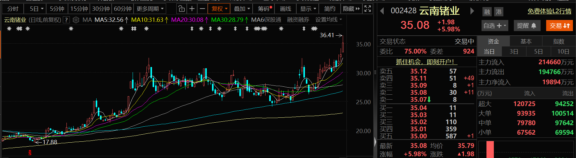 1月8日,云南锗业股价出现上涨,截至8日14:20分,云南锗业涨5.98%,报35.08元/股。
