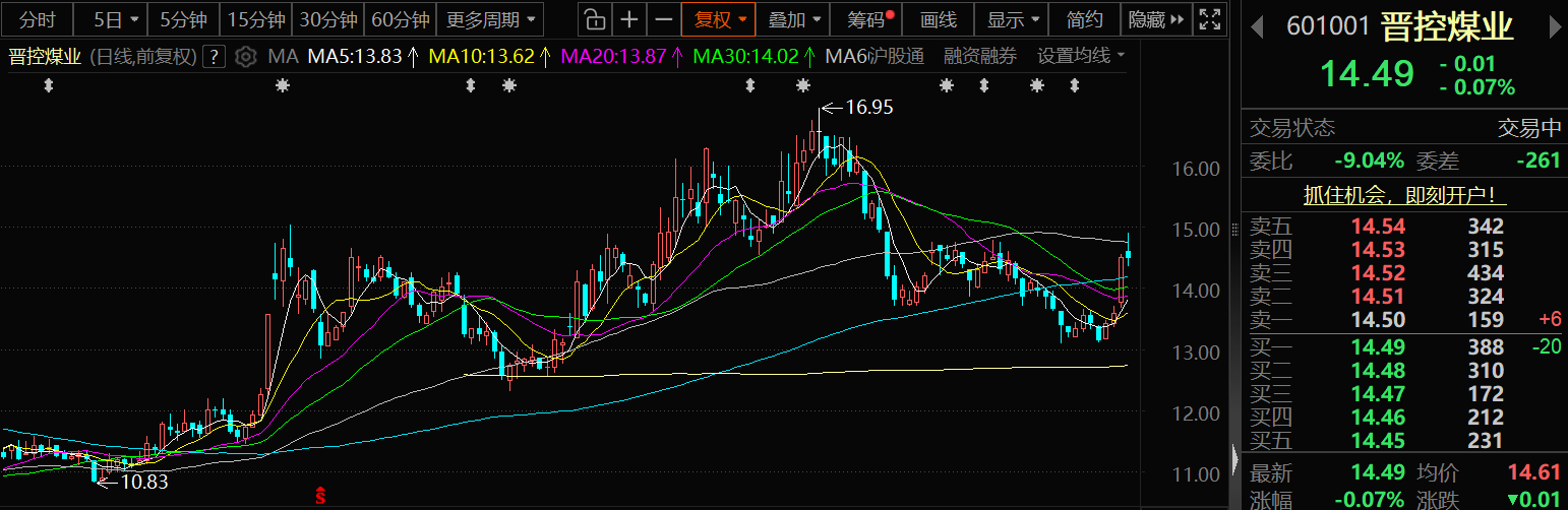1月8日,晋控煤业的股价窄幅波动,截至8日14:49分,晋控煤业跌0.07%,报14.49元/股。