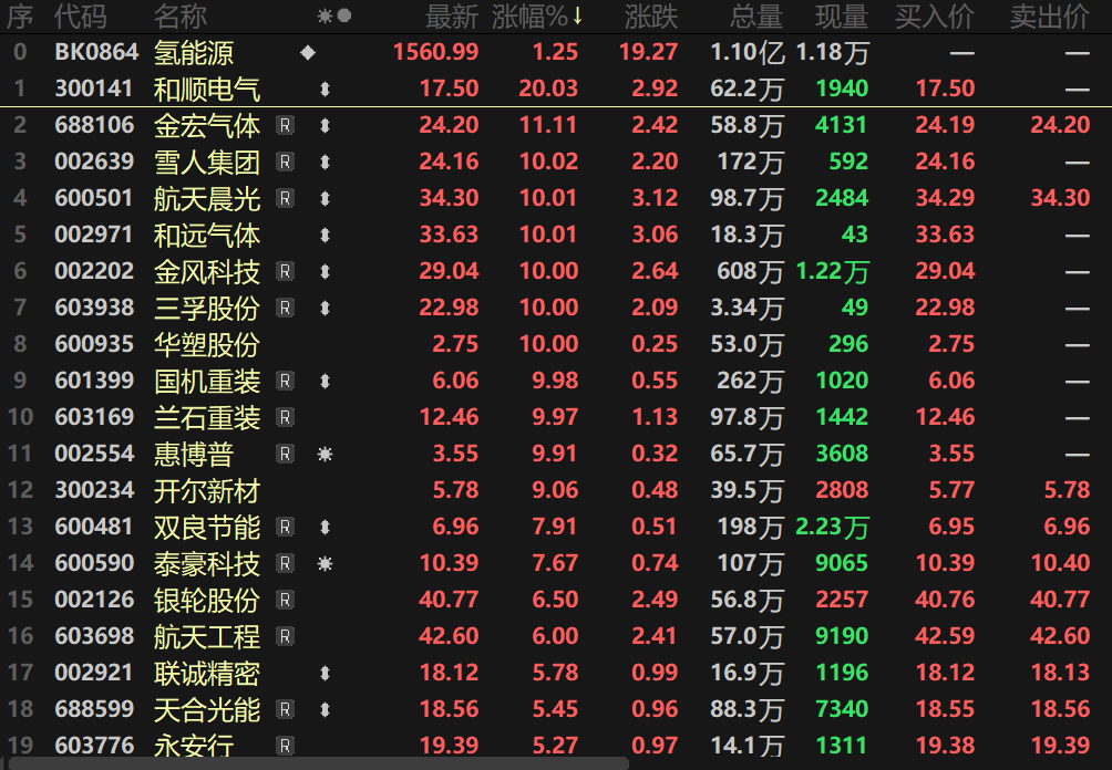 个股方面,今日氢能源板块个股掀起了轰轰烈烈的涨停潮,和顺电气盘中20CM涨停,双良节能、雪人集团、和远气体、三孚股份等近8股盘中涨停,金风科技、泰豪科技等多股纷纷跟涨。