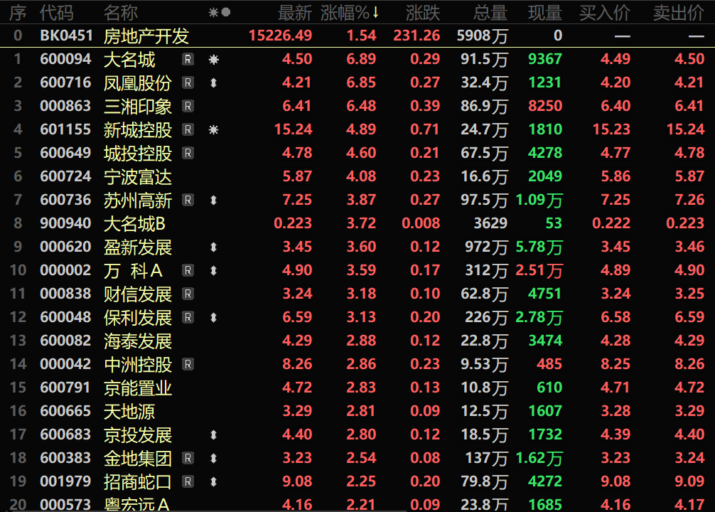 SMM1月8日讯: 《求是》杂志特约评论员文章称,要深刻把握房地产业发展规律,正确认清当前形势,保持战略定力,积极主动作为,以更有力更精准的举措,加强对房地产市场的宏观调控,持续改善和稳定房地产市场预期,尽可能缩短调整时间。政策红利与市场成交有所回暖形成共振,成为板块上涨的重要支撑:2026年1月1日起正式实施的个人住房增值税新政,成为激活市场交易的关键抓手。政策红利逐渐传导至市场成交端,元旦期间,北京二手房市场热度有所回升,部分房源带看热度显著走高;深圳门店二手住宅看房量、签约量同比均实现上涨。交易活跃度的提升,为房地产板块上涨奠定了坚实基础。行业风险化解取得进展,进一步增强市场信心:2025年以来,已有21家出险房企完成或获批债务重组,累计化债规模达1.2万亿元。房企化债攻坚的稳步推进,有效降低了行业系统性风险,显著修复了市场对行业发展的预期。此外,多机构预测2026年将迎来底部企稳。多重积极因素叠加,推动房地产板块逆势走强。截至1月8日收盘,房地产开发板块上涨1.54%,房地产服务板块上涨1.98%;个股方面:大名城、凤凰股份、三湘印象等涨超6%,全新好、世联行、新城控股以及城投控股等多只个股涨幅居前。