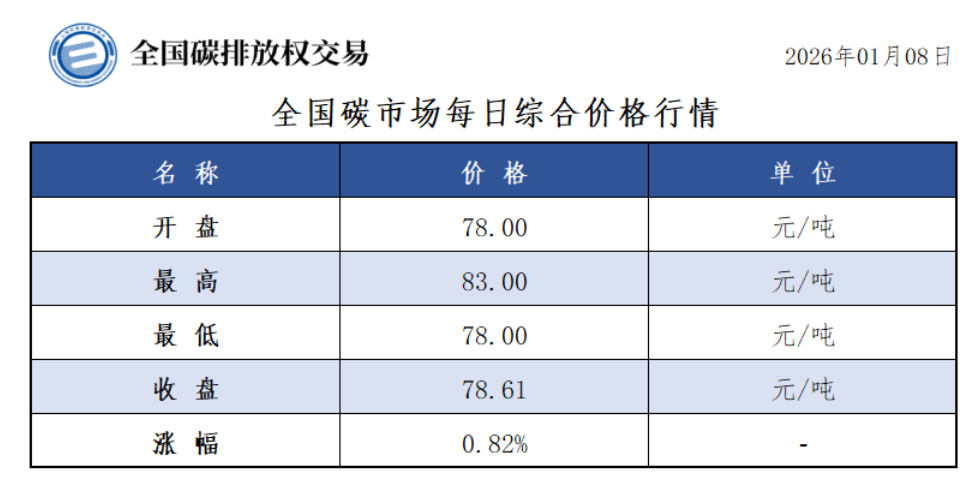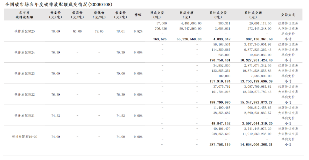 1月8日讯: 今日全国碳市场综合价格行情为: 开盘价78.00元/吨,最高价83.00元/吨,最低价78.00元/吨,收盘价78.61元/吨,收盘价较前一日上涨0.82%。 今日挂牌协议交易成交量57,000吨,成交额4,481,000.00元;大宗协议交易成交量706,626吨,成交额50,747,560.00元;今日无单向竞价。 今日全国碳排放配额总成交量763,626吨,总成交额55,228,560.00元。 2026年1月1日至1月8日,全国碳市场碳排放配额成交量4,240,658吨,成交额318,952,651.50元。 截至2026年1月8日,全国碳市场碳排放配额累计成交量869,107,178吨,累计成交额57,981,570,883.07元。