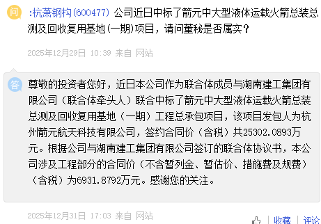 证券时报·e公司记者注意到,杭萧钢构股价的涨停似乎与公司在互动平台上的一则回应有直接关系。 2025年12月29日10:39,有投资者在“E互动”上对杭萧钢构提问称:“公司近日中标了箭元中大型液体运载火箭总装总测及回收复用基地(一期)项目,请问董秘是否属实?” 对于上述问题,上市公司并未立刻予以回复。但在“商业航天”概念火热的当下,这个提问很快引发了公司股价的异动。2025年12月29日下午开盘后,杭萧钢构股价快速拉升至涨停,并保持至收盘。 2025年12月31日17:03,杭萧钢构对上述提问作出了回答。上市公司称,近日公司作为联合体成员与湖南建工集团(联合体牵头人)联合中标了箭元中大型液体运载火箭总装总测及回收复用基地(一期)工程总承包项目(下称“火箭总装基地承包项目”)。该项目发包人为杭州箭元航天科技有限公司(下称“箭元航天”),签约合同价(含税)共25302.09万元。公司涉及工程部分的合同价(不含暂列金、暂估价、措施费及规费)(含税)为6931.88万元。