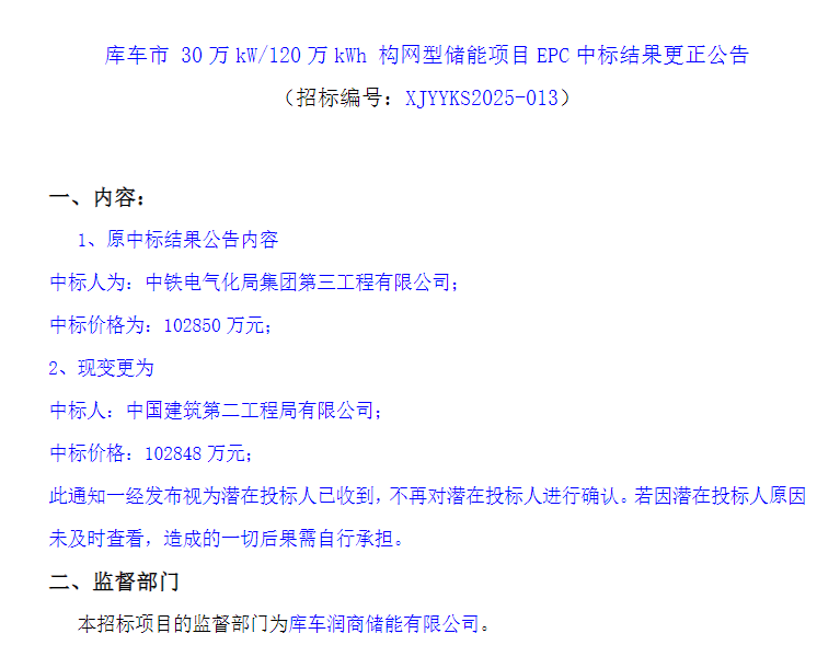 北极星储能网讯:2026年1月8日,库车市300MW/1.2GWh构网型储能项目EPC中标结果更正公告。原中标人为中铁电气化局集团第三工程有限公司,中标价格为102850万元,现变更中标人为中国建筑第二工程局有限公司,中标价格为102848万元。 该项目于2025年12月8日发布中标公告,时隔一个月后公告变更中标人。 公告还指出,此通知一经发布视为潜在投标人已收到,不再对潜在投标人进行确认。若因潜在投标人原因未及时查看,造成的一切后果需自行承担。 本项目共建设300MW/1.2GWh构网型储能,其中建设300MW/1.2GWh磷酸铁锂储能及1座 220kV 升压汇集站。并包括 储能工程、升压站、送出工程及其配套建筑工程等。 项目要求近三年已完成的单体容量大于等于100MW/200MMh的电力建设工程业绩不得少于2项。 原文如下: