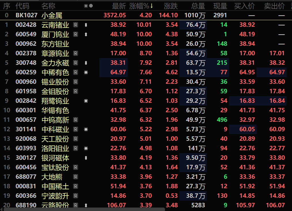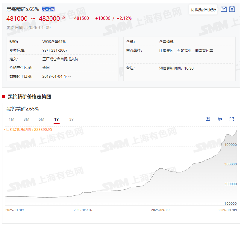 SMM1月9日讯: 节后归来,钨价受多重利好因素共振提振:市场对节后补库需求的预期持续升温,钨原料现货供应维持偏紧格局,叠加多家钨冶炼企业相继上调长单报价,多重支撑下,钨价自1月6日起再度开启上行通道。此前黑钨精矿在2025年创下的460500元/标吨均价历史新高,也在1月7日至9日期间被连续突破,刷新历史价格纪录。需求端来看,AI、新能源、商业航天三大高景气赛道的需求放量,持续打开小金属品类的成长空间。此外,部分市场资金对有供给收缩预期的战略小金属的青睐等也带动小金属板块的飙升。截至1月9日10:36分,小金属行业大涨4.2%,个股方面:云南锗业、厦门钨业、东方钽业涨停,章源钨业、金力永磁、中稀有色、锡业股份、金钼股份、翔鹭钨业以及华锡有色等涨幅居前。