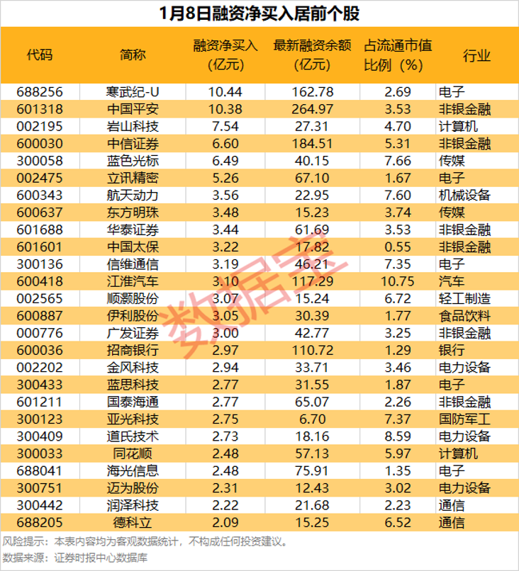 6股获杠杆资金净买入均超5亿元 截至1月8日,市场融资余额合计2.6万亿元,较前一交易日增加159.44亿元,这已经是融资余额连续4个交易日持续增加。 具体到个股,1月8日获融资净买入1亿元以上的有74股,其中,6股融资净买入额均超5亿元。 寒武纪-U融资净买入额居首,当日净买入10.44亿元;其次是中国平安、岩山科技,融资净买入金额分别为10.38亿元、7.54亿元。 融资净买入金额居前的还有中信证券、蓝色光标、立讯精密等。