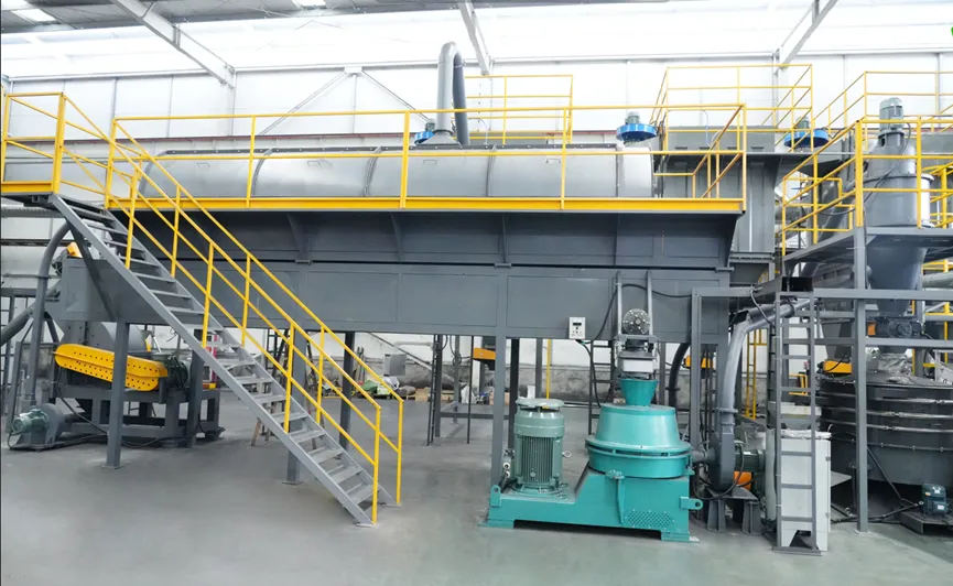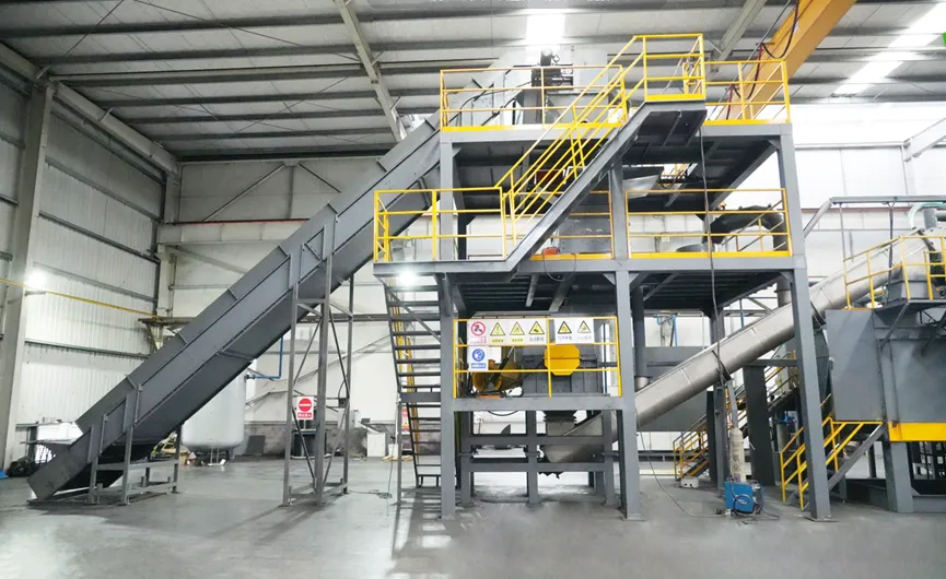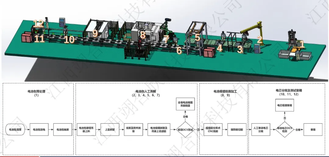 破碎分选:裂解后的物料通过破碎机、空分机、磁选机、色选机、研磨机、分级机、铜铝分选机等设备分选出外壳、正负极粉、铜颗粒、铝颗粒等物料所有物料均能达到可销售状态,没有混合物料. 浩翊科技开发的锂电池带电破碎设备 1、特有能量回收工艺,使生产成本每吨不到500元,低于同行50%。 2、破碎线的处理能力≥1.5 T/h 年处理量10000吨。 3、黑粉的回收率98%以上,铜的纯度>96%,铝里面含铜量低于4%。 4、废气通过二次燃烧、急冷、多次洗涤、气液分离、活性炭吸附达标排放。 5、车间清洁度很高,无明显黑粉尘。 梯次电池拆解线