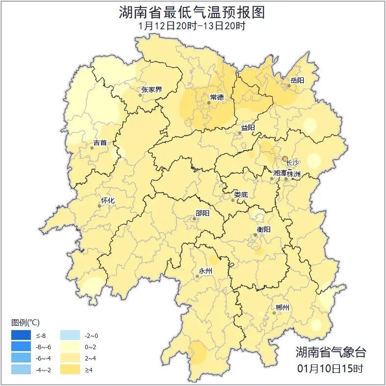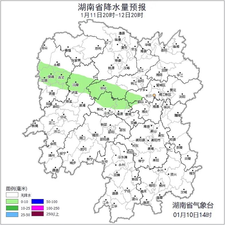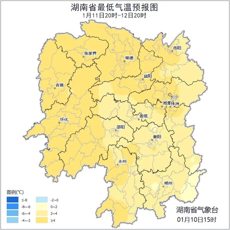 11日晚上至12日白天,多云,湘西州中部、怀化北部、益阳西部、娄底西部、长沙西部局地有小雨;北风2~3级;最低气温3~6℃;最高气温14~18℃。