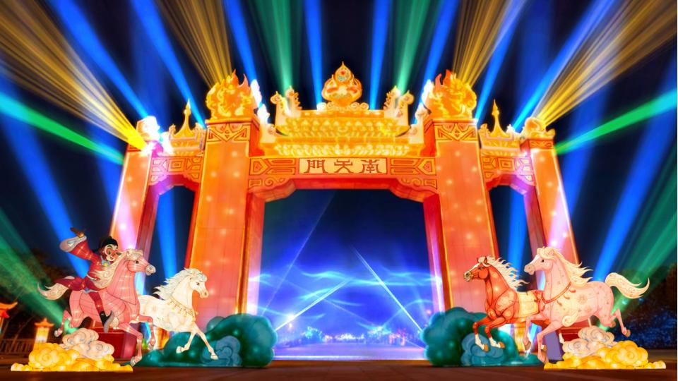 ▲南天门造型花灯效果图 在世园国际旅游度假区一号门入口处,高达12米的“南天门”是本次灯会造型最大花灯,配合科技光束,整个“南天门”将邀请人们走入“天宫”。步入花灯区,“水帘洞”亦真亦幻,“福禄寿三星”憨态可掬,20匹“骏马”组成“万马苑”气势恢宏,20多米长的动画长廊,将《大闹天宫》动画中的经典画面一一呈现。游客还可以在土地庙造型的花灯抽签,为新的一年寻一个好彩头,与太白金星造型花灯互动合影打卡。花灯区内还设有凌霄妙会,让游客可以感受延庆当地美食和非遗。