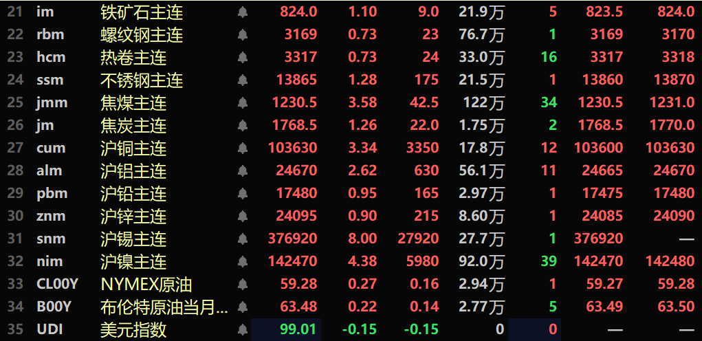 SMM1月12日讯: 金属市场方面: 截至午间收盘,内盘基本金属全线上涨,沪铝涨2.26%。沪铜涨3.34%。沪铅涨0.95%,沪锌涨0.9%。沪锡以8%的涨幅涨停,沪镍涨4.38%。 此外,铸造铝主连期货涨2.17%,氧化铝主连涨0.96%。碳酸锂主连以9%的涨幅涨停。工业硅主连涨1.44%。多晶硅主连涨0.07%。 黑色系均飘红,铁矿涨1.1%,螺纹涨0.73%,热卷涨0.73%,不锈钢涨1.28%。双焦方面:焦煤主力合约涨3.58%,焦炭主力合约涨1.26%。 外盘基本金属方面,截至11:48分,LME金属均飘红。伦铜涨1.52%,伦铝涨0.52%。伦铅涨0.64%。伦锌涨0.71%。伦锡涨3.96%。伦镍涨1.3%。 贵金属方面,截至11:48分,COMEX黄金涨1.92%,盘中刷新历史新高至4612.7美元/盎司;COMEX白银涨5.2%,盘中刷新历史新高至83.905美元/盎司。内盘贵金属方面:沪金主连涨2.64%,盘中刷新历史新高至1031.3元/克;沪银主连涨12.82%,盘中刷新历史新高至20685元/千克。 此外,截至午间收盘,铂主连期货涨5.53%,钯主连期货涨4.15%。 截至午间收盘,欧线集运主力合约涨11.42%,报1282.2点。 截至1月12日11:48分,部分期货午间行情: