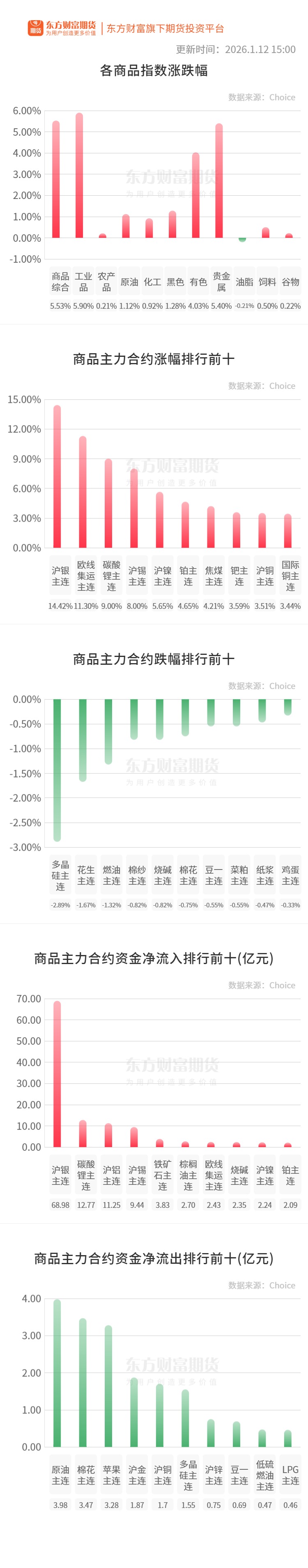 行情纵览![]() 宏观产经证券时报:据《纽约时报》当地时间1月11日报道,美国哥伦比亚特区联邦检察官办公室已就美国联邦储备委员会华盛顿总部翻修相关事宜,对美联储主席鲍威尔启动刑事调查。 财联社:华尔街明星基金经理、方舟投资的掌门人凯茜伍德(Cathie Wood)最新预测,美国总统特朗普将在2026年中期选举前开始购买比特币作为战略储备,以保持政治势头和加密货币选民的支持。 中国人民银行:央行公告,2026年1月12日,中国人民银行以固定利率、数量招标方式开展了861亿元7天期逆回购操作,操作利率为1.40%,投标量与中标量均为861亿元。 品种资讯黑色系期货 铁矿石:2026年01月05日-01月11日中国47港铁矿石到港总量3015.0万吨,环比增加190.3万吨;中国45港铁矿石到港总量2920.4万吨,环比增加164.0万吨;北方六港铁矿石到港总量1469.2万吨,环比减少43.7万吨。 2026年1月5日-1月11日Mysteel全球铁矿石发运总量3180.9万吨,环比减少32.8万吨。澳洲巴西铁矿发运总量2606.4万吨,环比减少136.4万吨。澳洲发运量1931.6万吨,环比减少8.0万吨,其中澳洲发往中国的量1652.0万吨,环比增加36.7万吨。巴西发运量674.8万吨,环比减少128.3万吨。(我的钢铁网) 焦煤:1月12日蒙古国ER公司炼焦煤进行线上竞拍,蒙3#精煤A11、V20-28、S0.85、G75、Mt10起拍价800元/吨,挂牌数量1.28万吨全部成交,成交价格935元/吨,较上期8日上涨5元/吨,以上价格均不含税。供货地点为中国甘其毛都口岸监管区,供货时间为付款后90天内,最后供应日期为2026年4月12日。(我的钢铁网) 农产品期货 棕榈油:据马来西亚独立检验机构AmSpec,马来西亚1月1日-10日棕榈油出口量为466457吨,较前一月同期出口的396477吨增加17.65%。(新华财经) 生猪:据农业农村部监测,截至1月12日14:00时,全国农产品批发市场猪肉平均价格为17.83元/公斤,较上周五下降0.8%;鸡蛋平均价格为7.61元/公斤,较上周五上升0.8%。(新华财经) 有色/贵金属期货 沪锌:据SMM了解,西南某锌冶炼厂2026年下半年结合自有矿山产量释放,锌冶炼产能预计增长一倍,到2027年初预计锌产能可以达到13万吨。(SMM) 沪铜:铜价持续高位运行,对下游采购情绪形成显著压制出库节奏疲软,国内电解铜社会库存已连续六周累库。据SMM数据,截至2026年1月12日,电解铜社会库存同比大幅增长18.53万吨,增幅达171.42%,直观反映出当前终端消费较去年同期显著疲软。(SMM) 氧化铝:据Mysteel调研了解,新疆地区氧化铝招标采购价格为2900-2910元/吨(到厂价),北方地区货源,较上一笔下跌10-20元/吨。(我的钢铁网) 能化期货 纯碱:截止到2026年1月12日,本周,国内纯碱厂家总库存156.47万吨,较上周四降0.8万吨,降幅0.51%。其中,轻质纯碱84.40万吨,环比增加0.75万吨,重质纯碱72.07万吨,环比降1.55万吨。(隆众资讯) PTA:本周供应端变化不大,需求端有转弱预期,平衡表逐步转为累库,然地缘政治影响下,国际油价大幅走强,成本端支撑坚挺,短期PTA市场价格重心或将走强,预计华东PTA现货商谈价格在5000-5300。(隆众资讯) 乙二醇:截至1月12日,华东主港地区MEG库存总量73.7万吨,较上一期增加4.7万吨,详细来看,张家港32.7万吨,太仓24万吨,江阴及常州11.5万吨,上海及常熟5.5万吨。发货方面:周内张家港日均发货7000吨,太仓日均发货9300吨附近。(隆众资讯) 晚间关注无 (文章来源:东方财富研究中心) |