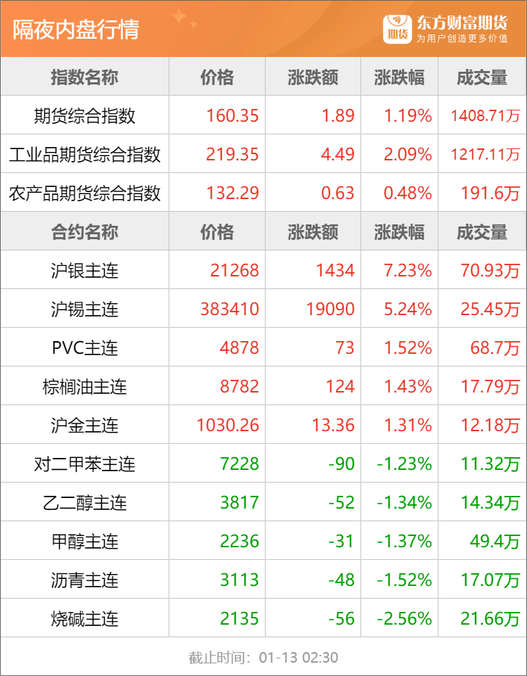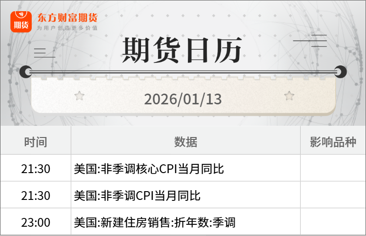 隔夜行情![]() ![]() 每日精选特朗普:对伊朗贸易伙伴征收25%关税 石油版图大地震!美国恐将掌控全球30%储量 欧佩克的噩梦出现了? 广期所再出自律监管措施 持续打击违规交易行为 宏观产经新华社:中共中央总书记、国家主席、中央军委主席习近平12日上午在中国共产党第二十届中央纪律检查委员会第五次全体会议上发表重要讲话。他强调,以更高标准、更实举措推进全面从严治党,更加坚决有力地贯彻落实党中央重大决策部署,更加科学有效地把权力关进制度笼子,更加清醒坚定地推进反腐败斗争,为实现“十五五”时期目标任务提供坚强保障。 澎湃新闻:1月12日,外交部发言人毛宁主持例行记者会。日本朝日新闻记者提问,关于中国对日本出口稀土一事,据报道,包括明确民事用途在内的稀土对日本的出口许可审查被暂停,中国国有企业通知部分日本企业将不再签订新的稀土合同等。对此,毛宁回应:“具体的情况建议你向中方的主管部门了解,我想说的是,中方依法依规采取有关措施,完全是正当、合理、合法。” 商务部网站:1月12日,商务部在官网通报了中欧电动汽车案的最新磋商进展。中国机电商会认为,妥善解决欧盟对华电动汽车反补贴案,是中欧电动汽车上下游业界的普遍期待,有助于促进中欧相关产业链供应链的安全稳定,维护中欧经贸合作大局及以规则为基础的国际贸易秩序。中欧双方本着相互尊重和对话精神,经过多轮磋商,成功推动该案实现“软着陆”。为此,欧方将发布《关于提交价格承诺申请的指导文件》,并在文件中确认,欧方将秉持非歧视原则,根据世贸组织规则有关规定,对每一项价格承诺申请,适用相同法律标准,并以客观和公正的方式进行评估。 品种资讯黑色系期货 钢材:钢银电商最新数据显示,截至1月12日当周,全国38个城市,共计135个仓库的城市钢材总库存量为698.22万吨,较上周环比减少6.40万吨,降幅0.91%。(新华财经) 铁矿石:2026年01月05日-01月11日中国47港铁矿石到港总量3015.0万吨,环比增加190.3万吨;中国45港铁矿石到港总量2920.4万吨,环比增加164.0万吨;北方六港铁矿石到港总量1469.2万吨,环比减少43.7万吨。 2026年1月5日-1月11日Mysteel全球铁矿石发运总量3180.9万吨,环比减少32.8万吨。澳洲巴西铁矿发运总量2606.4万吨,环比减少136.4万吨。澳洲发运量1931.6万吨,环比减少8.0万吨,其中澳洲发往中国的量1652.0万吨,环比增加36.7万吨。巴西发运量674.8万吨,环比减少128.3万吨。(我的钢铁网) 农产品期货 生猪:国家发展和改革委员会价格监测中心最新数据显示,截至2026年1月7日,生猪价格为12.67元/公斤,玉米价格为2.30元/公斤,猪粮比价为5.51。与2025年12月31日相比,生猪价格上涨了2.10%,玉米价格持平,猪粮比价上涨了2.04%。(发改委网站) 棕榈油:据Mysteel,截至2026年1月9日(第2周),全国重点地区棕榈油商业库存73.6万吨,环比上周增加0.22万吨,增幅0.30%;同比去年50.12万吨增加23.48万吨,增幅46.85%。(我的钢铁网) 南部半岛棕榈油压榨商协会(SPPOMA)数据显示,2026年1月1-10日马来西亚棕榈油单产环比上月同期减少20.49%,出油率环比上月同期持平,产量环比上月同期减少20.49%。(新华财经) 玉米:农业农村部发布1月中国农产品供需形势分析:2025/26年度中国玉米生产数据根据国家统计局公告进行调整,播种面积调整为44961千公顷,比上年增0.5%;单位面积产量调整为每公顷6700公斤,比上年增1.6%;总产量调整为30124万吨,比上年增2.1%,再创历史新高。(农业农村部) 有色/贵金属期货 贵金属:1月12日,上金所发布通知,近期受多重因素影响,贵金属价格波动显著加剧,不确定性持续上升。请各会员单位密切关注市场行情变化,继续做细做好风险应急预案,维护市场平稳运行。同时,提示投资者做好风险防范工作,合理控制仓位,理性投资。(界面新闻) 沪铜:铜价持续高位运行,对下游采购情绪形成显著压制出库节奏疲软,国内电解铜社会库存已连续六周累库。据SMM数据,截至2026年1月12日,电解铜社会库存同比大幅增长18.53万吨,增幅达171.42%,直观反映出当前终端消费较去年同期显著疲软。(SMM) 碳酸锂:受锂电池出口抢跑预期影响,1月12日ICC电池级碳酸锂(99.5%)现货结算指导价格为152000元/吨,较上一工作日上涨10000元;电池级氢氧化锂(56.5%粗颗粒)结算指导价格为120000元/吨,较上一工作日上涨10000元。根据鑫椤资讯样本企业调研,目前近5成的企业认为碳酸锂价格将在4月1日前冲上20万元,30%的企业认为有望达到25万元,另有小部分企业认为可以再登30万以上。(财联社) 能化期货 原油:维托尔集团和托克集团就潜在的委内瑞拉原油销售事宜与中印大型炼油商展开磋商。此前数日,这两家贸易巨头已获得美国政府初步批准销售委内瑞拉原油。据知情人士透露,周末这两家贸易商已联系亚洲主要买家。他们补充称,磋商尚处初期阶段,尚未提出正式报价。(财联社) 纯碱:截止到2026年1月12日,本周,国内纯碱厂家总库存156.47万吨,较上周四降0.8万吨,降幅0.51%。其中,轻质纯碱84.40万吨,环比增加0.75万吨,重质纯碱72.07万吨,环比降1.55万吨。(隆众资讯) 乙二醇:截至1月12日,华东主港地区MEG库存总量73.7万吨,较上一期增加4.7万吨,详细来看,张家港32.7万吨,太仓24万吨,江阴及常州11.5万吨,上海及常熟5.5万吨。发货方面:周内张家港日均发货7000吨,太仓日均发货9300吨附近。(隆众资讯) 其他期货 欧线集运:据上海航运交易所数据,截至2026