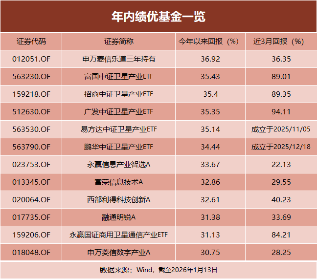 绩优基金开启限购! 1月13日,永赢基金旗下两只“智选系列”产品发布限购公告,一是聚焦卫星互联网方向的永赢高端装备智选,一是聚焦AI应用的永赢信息产业智选,两只基金均公告,为保护基金份额持有人利益,自1月14日起对个人投资者单日单账户设置100万元申购上限。 2026年,A股市场迎来强劲开局,基金赚钱效应良好,Wind数据显示,截至1月13日,全市场已有103只基金(仅统计主基金)年内回报超20%。 绩优基金开启限购 1月13日,永赢基金旗下两只“智选系列”产品——永赢高端装备智选、永赢信息产业智选发布限购公告。 为保护基金份额持有人利益,自 2026年 01 月 14 日起,个人投资者办理本基金(A 类及 C 类份额合并计算)的申购(含定期定额投资)、转换转入业务时,如单日单个基金账户单笔申请金额高于100万元(不含),本基金管理人有权全部或部分确认失败;如单日单个基金账户多笔累计申请金额高于100万元(不含),则对申请按照申请金额从大到小排序,逐笔累加至符合不超过100万元限额的申请确认成功,其余笔数本基金管理人有权全部或部分确认失败。机构投资者办理本基金的申购(含定期定额投资)、转换转入业务,不设限额金额。 值得一提的是,上述两只基金主要投资方向均为近期市场热门方向,包括卫星产业链和AI应用等。 同一日,平安中证卫星产业指数基金公告从2026年1月13日(含)起暂停本基金的大额申购、定期定额投资和转换转入业务,本基金单日单个基金账户累计申购(含定期定额投资和转换转入)的最高金额为100万元(含)(本基金A类、C类、E类基金份额申请金额予以合并计算)。 超百只基金年内回报超20% 2026年,A股市场迎来强劲开局,基金赚钱效应良好。Wind数据显示,截至1月13日,全市场已有103只基金(仅统计主基金)年内回报超20%,其中12只基金(仅统计主基金)年内回报超30%。