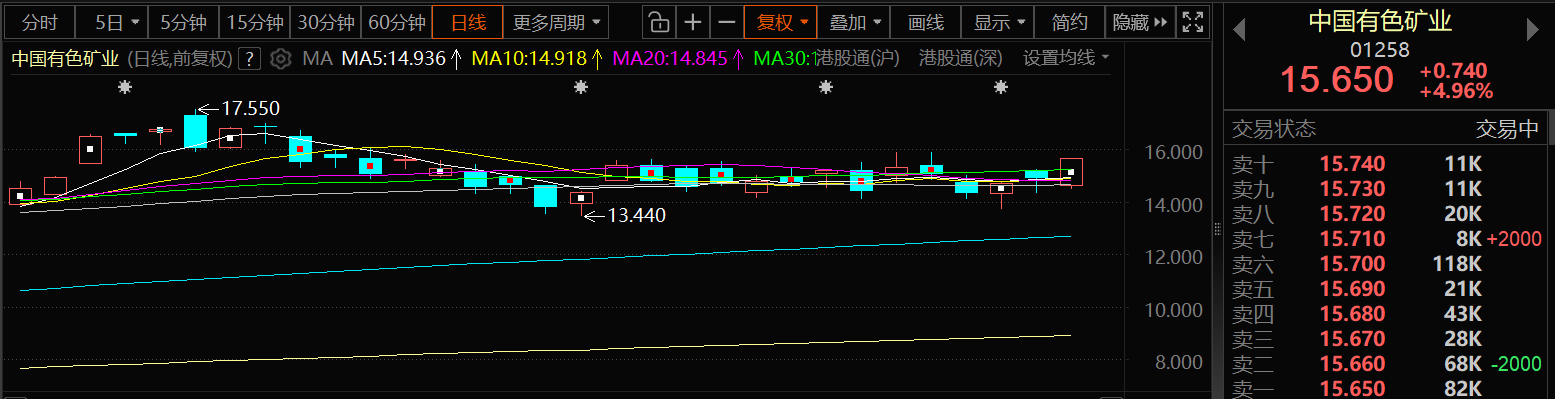 1月13日,中国有色矿业的股价出现上涨,截至13日15:16分,中国有色矿业涨4.96%,报15.65港元/股。