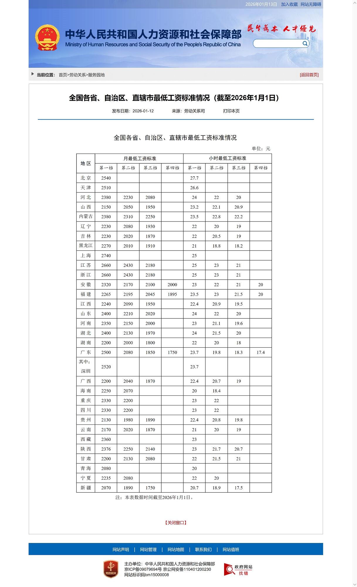 1月12日,中华人民共和国人力资源和社会保障部官网公布全国各省、自治区、直辖市最低工资标准情况(截至2026年1月1日)。