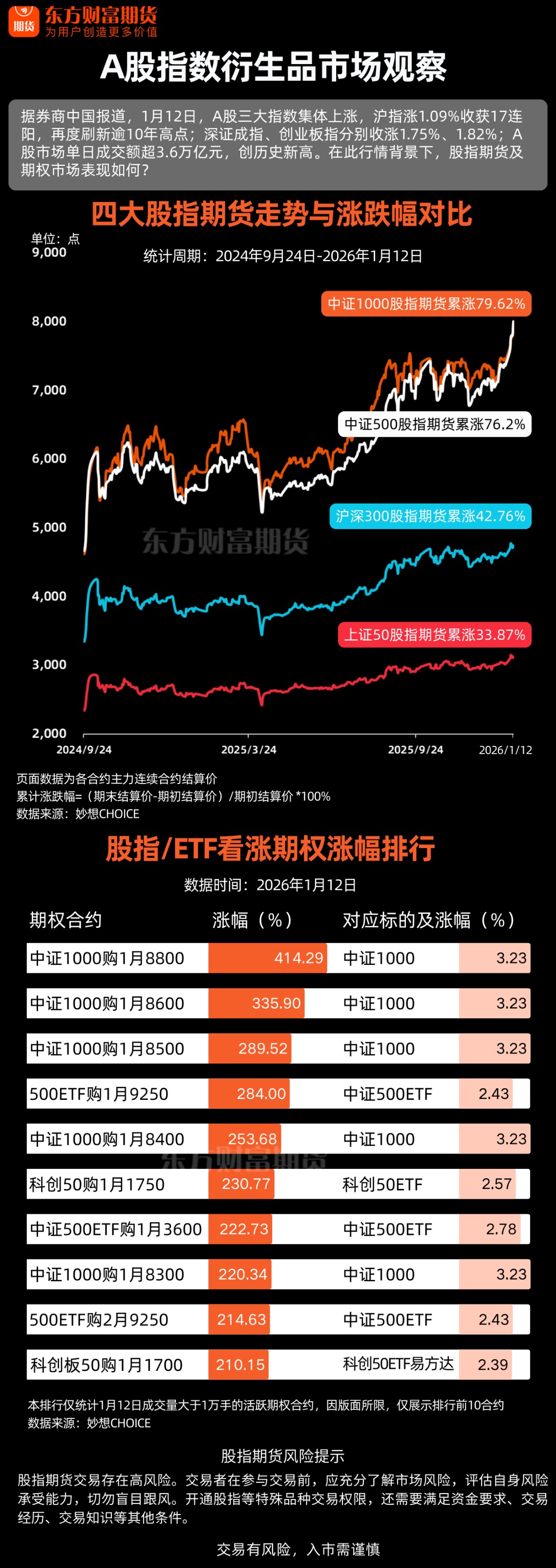 据券商中国报道,1月12日,A股三大指数集体上涨,沪指涨1.09%收获17连阳,再度刷新逾10年高点;深证成指、创业板指分别收涨1.75%、1.82%;A股市场单日成交额超3.6万亿元,创历史新高。