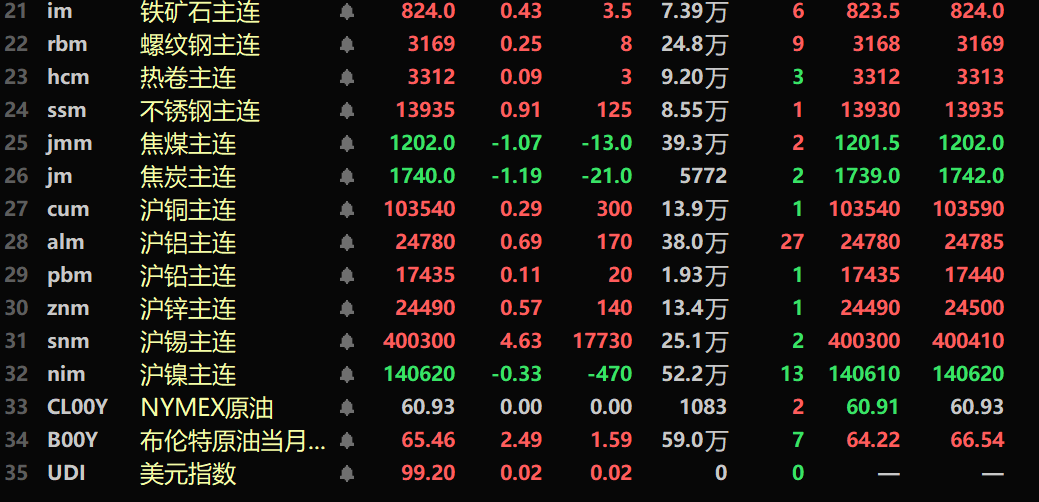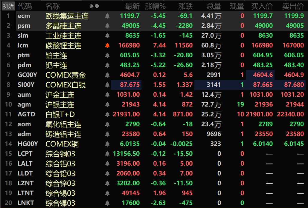 SMM1月14日讯: 金属市场方面: 隔夜内盘基本金属普涨。沪铜涨0.29%。沪铝涨0.69%,沪铅涨0.11%。沪锌涨0.57%。沪锡涨4.63%。沪镍跌0.33%。此外,氧化铝主力期货跌0.64%,铸造铝主连涨0.64%。 隔夜黑色系多飘红,铁矿涨0.43%,不锈钢涨0.91%,螺纹钢涨0.25%,热卷涨0.09%。双焦方面:焦煤跌1.07%,焦炭跌1.19%。 隔夜外盘金属方面,LME基本金属涨跌互现。伦镍跌2.63%,伦铜跌0.12%。伦铝涨0.16%,伦锌跌0.36%。伦铅涨0.34%。伦锡涨1.96%。 隔夜贵金属方面:COMEX黄金跌0.44%,盘中刷新历史新高至4644美元/盎司;COMEX白银涨2.08%,盘中刷新历史新高至89.125美元/盎司。内盘贵金属方面:沪金主连涨0.14%,盘中刷新历史新高至1038.7元/克;沪银主连涨4.14%,盘中刷新历史新高至22446元/千克。 截至1月14日8:09分,隔夜收盘行情: