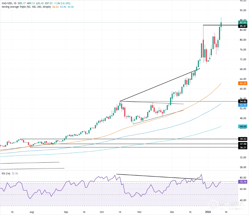 【华通白银网1月14日】•银价在回落前触及89.11美元的历史新高,盘中仍录得强劲涨