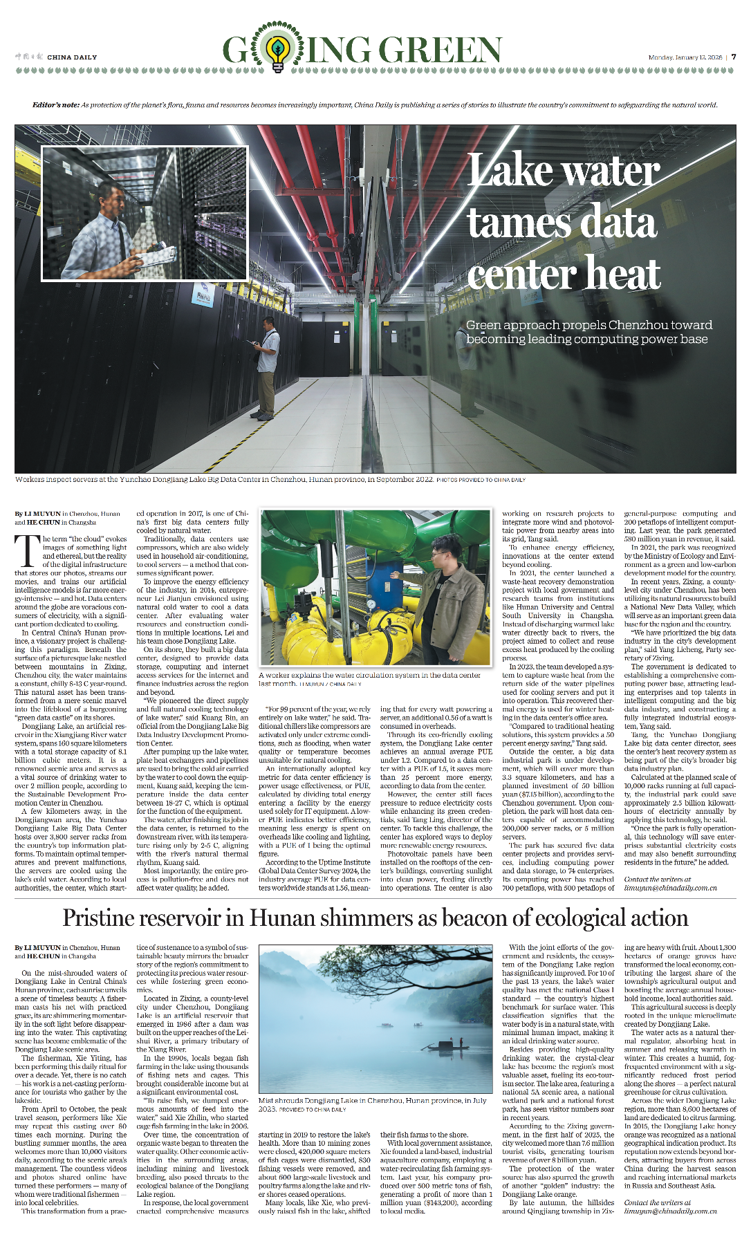 为提高能效,该中心也致力于其他领域的创新。2021年,该中心联合当地政府以及来自湖南大学、中南大学等机构的研究团队共同启动了余热回收示范项目。该项目旨在回收冷却过程中产生的多余热量并加以利用,而非简单地将升温的湖水排回河道。 2023年,团队研发的余热回收技术实现示范运行,从冷冻水回水侧回收数据中心余热,用于数据中心办公区的冬季供暖。“与传统供暖方案相比,这套系统可节能50%。”唐灵说。 据郴州市政府介绍,在大数据中心之外,一个大数据产业园正在建设中。该园区规划面积超过3.3平方公里,计划投资500亿元人民币。建成后,园区将容纳可承载20万个服务器机架(即500万台服务器)的数据中心。 园区现已落地5个数据中心项目,为74家企业提供算力、数据存储等服务。其算力已达到700 PFLOPS,其中通用算力500 PFLOPS,智能算力200 PFLOPS。据介绍,去年该园区实现营收5.8亿元。 2021年,该园区被生态环境部评为国家绿色低碳典型案例。 近年来,资兴市利用其自然资源打造“国家新型数据谷”,旨在建设成为该地区乃至全国重要的绿色数据基地。 “我们坚持把大数据产业作为重中之重,致力于打造国家新型数据谷,全力建设国、省重要算力基地。”资兴市委书记杨理诚表示,“吸引智能计算和大数据产业的龙头企业与顶尖人才,构建完整的产业生态系统。” 唐灵认为,东江湖大数据中心的余热回收系统也能够为全市大数据产业规划做出贡献。他估算,若以1万个机架满载运行计算,应用此项技术产业园每年可节约用电25亿度。 “产业园区建成运行后,余热回收技术将为园区企业节约大量的用电成本,以后也可能造福周边居民。”他补充道。 |