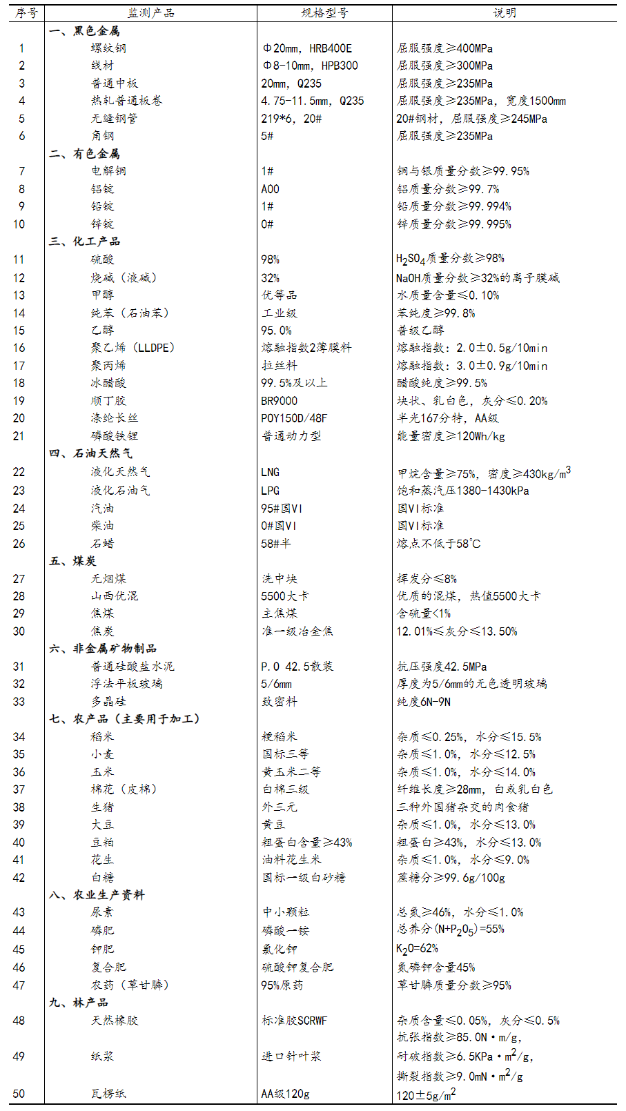 附注 1.指标解释 流通领域重要生产资料市场价格,是指重要生产资料经营企业的批发和销售价格。与出厂价格不同,生产资料市场价格既包含出厂价格,也包含有经营企业的流通费用、利润和税费等。出厂价格与市场价格互相影响,存在时滞,两者的变动趋势在某一时间段内有可能会出现不完全一致的情况。 2.监测内容 流通领域重要生产资料市场价格监测内容包括9大类50种产品的价格。类别与产品规格说明详见附表。 3.监测范围 监测范围涵盖全国31个省(区、市)300多个交易市场的近2000家批发商、代理商、经销商等经营企业。 4.监测方法 价格监测方法包括信息员现场采价,电话、即时通讯工具和电子邮件询价等。 5.涨跌个数的统计 产品价格上涨、下降、持平个数按照涨跌幅(%)进行统计。 附表 流通领域重要生产资料市场价格监测产品规格说明表