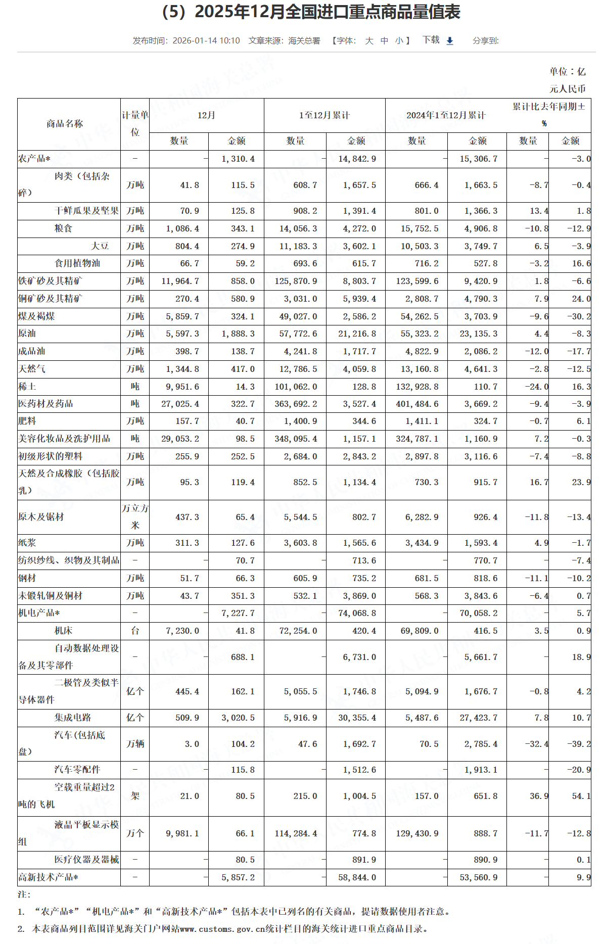 进口: 2025年12月铁矿砂及其精矿进口11,964.7万吨,同比2024年12月增加6.4%。2025年1~12月累计进口125,870.9万吨,同比2024年1~12月增加1.8%。 2025年12月铜矿砂及其精矿进口270.4万吨,同比2024年12月增长7.2%。2025年1~12月累计进口3,031.0万吨,同比2024年1~12月增加7.9%。 2025年12月煤及褐煤进口5,859.7万吨,同比2024年12月增长11.9%。2025年1~12月累计进口49,027.0万吨,同比2024年1~12月减少9.6%。 2025年12月稀土进口量达到9,951.6吨,同比2024年12月增长3.2%。2025年1~12月累计进口101,062.0吨,同比2024年1~12月减少24%。 2025年12月钢材进口量达到51.7万吨,同比2024年12月减少16.7%。2025年1~12月累计进口605.9吨,同比2024年1~12月减少11.1%。 2025年12月未锻轧铜及铜材进口43.7万吨,同比2024年12月减少21.8%。2025年1~12月累计进口532.1万吨,同比2024年1~12月减少6.4%。