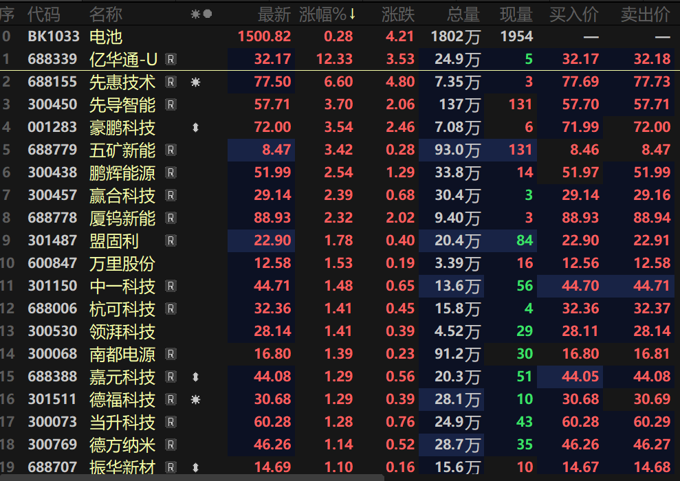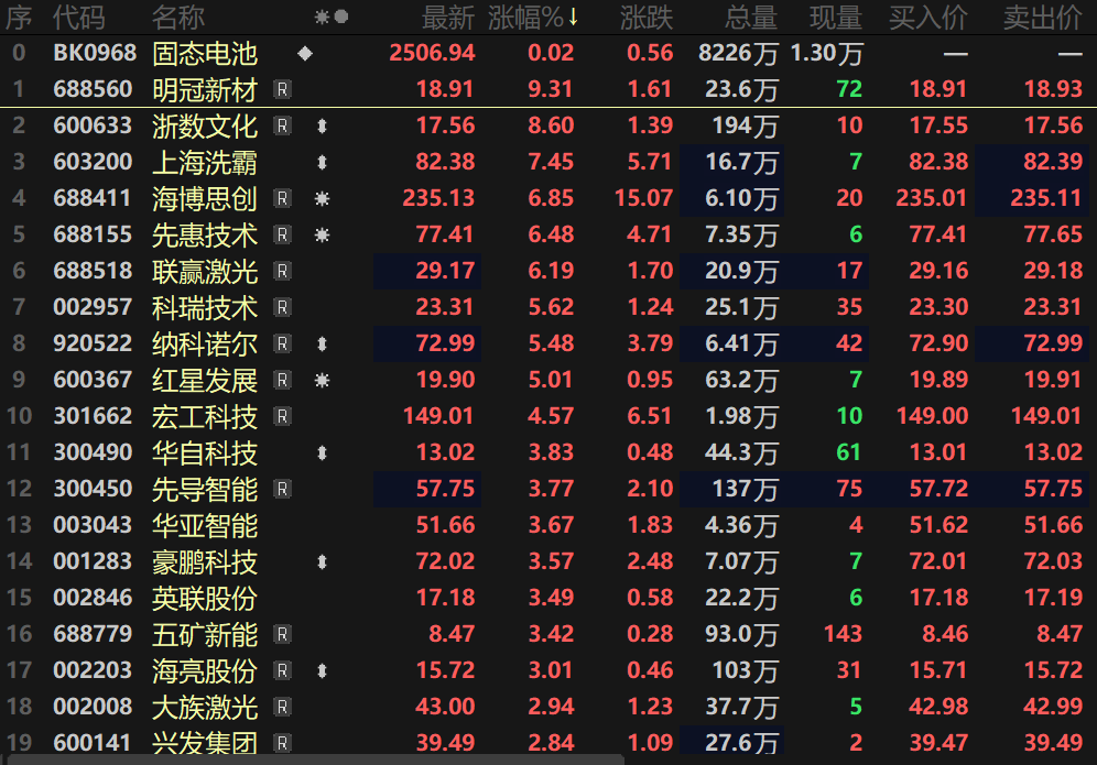 固态电池板块指数盘中同样一度涨逾2%,个股方面,上海洗霸盘中20CM涨停,海博思创、浙数文化盘中涨逾8%,普路通、赢合科技、海亮股份等多股纷纷跟涨。