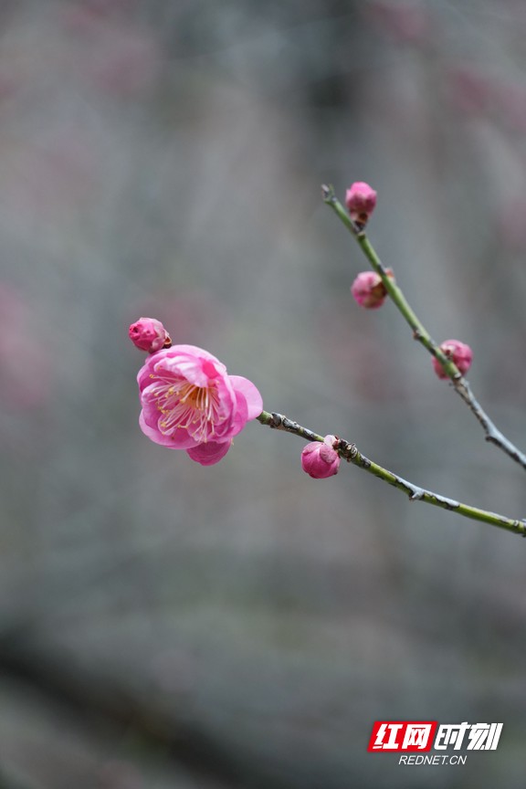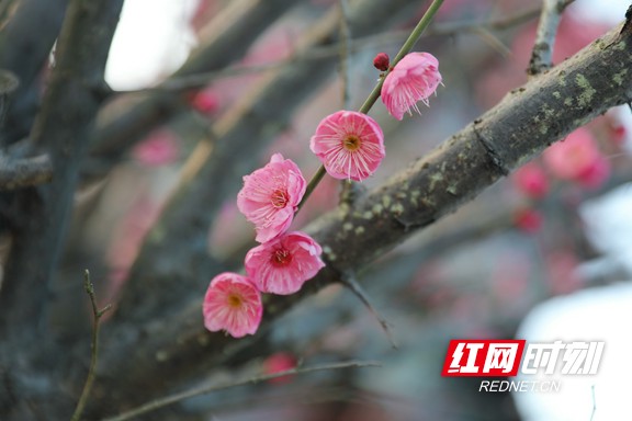 市民用镜头捕捉红梅初绽的唯美瞬间。