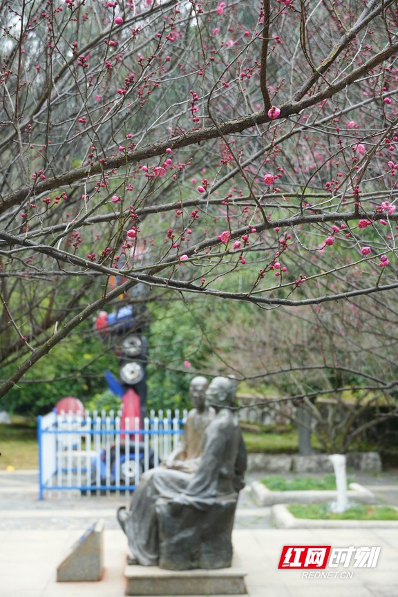 在公园的雕塑旁,几株红梅树虬枝横斜,粉嫩的花朵与古朴的雕塑相映成趣。