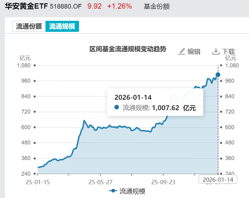 国内首只千亿元级黄金ETF“诞生”! 截至1月14日,华安黄金ETF最新份额达101.62亿份,规模迈上千亿元大关,达1007.62亿元,创下历史新高。