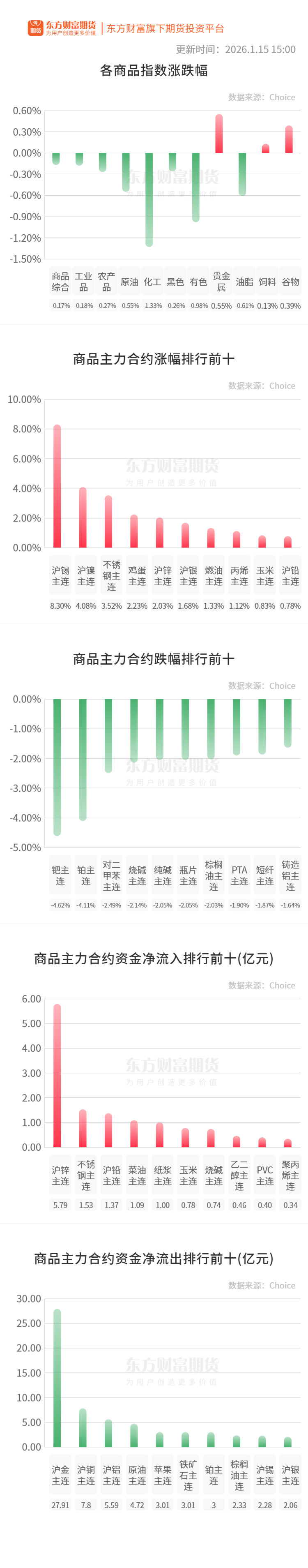 行情纵览![]() 宏观产经央行:初步统计,2025年末社会融资规模存量为442.12万亿元,同比增长8.3%。其中,对实体经济发放的人民币贷款余额为268.4万亿元,同比增长6.3%;对实体经济发放的外币贷款折合人民币余额为1.05万亿元,同比下降18%。 财联社:据央行数据,12月末,广义货币(M2)余额340.29万亿元,同比增长8.5%。狭义货币(M1)余额115.51万亿元,同比增长3.8%。流通中货币(M0)余额14.13万亿元,同比增长10.2%。全年净投放现金1.31万亿元。 第一财经:2026年1月1日,全国首套公积金贷款利率降至2.6%,逼近历史低点。随着新一轮利率下调落地,市场也在关注:公积金贷款利率是否仍存在进一步下调的空间?业内人士认为,贷款利率继续下调并非没有可能,但并不迫切,仍需关注商贷利率走势。 品种资讯黑色系期货 钢材:据Mysteel,截至1月15日当周,螺纹钢产量、厂库由增转降,社库连续第二周增加,表需由降转增,螺纹产量190.3万吨,较上周减少0.74万吨,降幅0.39%;螺纹厂库142.66万吨,较上周减少5.27万吨,降幅3.56%;螺纹社库295.41万吨,较上周增加5.23万吨,增幅1.8%;螺纹表需190.34万吨,较上周增加15.38万吨,增幅8.79%。(我的钢铁网) 海关总署最新数据显示,2025年,中国钢材出口总量达1.19亿吨,同比增长7.5%,创历史新高。与此同时,该出口总量对应的金额为5910.7亿元,同比减少0.7%。(财联社) 焦煤:本周,Mysteel统计523家炼焦煤矿山样本核定产能利用率为88.5%,环比增3.1%。原煤日均产量197.8万吨,环比增7.9万吨,原煤库存549.9万吨,环比增76.5万吨 ,精煤日均产量76.9万吨,环比增3.4万吨,精煤库存272.4万吨,环比减22.6万吨。(备注:由于本期新增一个调研样本,数据增幅明显)(Mysteel) 农产品期货 生猪:据农业农村部监测,截至1月15日14:00时,全国农产品批发市场猪肉平均价格为18.00元/公斤,较前一日下降0.3%;鸡蛋平均价格为7.81元/公斤,较前一日上升0.8%。(新华财经) 棕榈油:船运调查机构ITS数据显示,马来西亚1月1日-15日棕榈油出口量为727440吨,较前一月同期出口的613172吨增加18.64%。(新华财经) 有色/贵金属期货 沪锡:据新华社援引刚果(金)媒体报道,位于该国东部的北基伍省13日凌晨因强降雨发生山体滑坡,造成至少13人死亡、约40人失踪。强降雨引发的滑坡造成北基伍省瓦利卡莱地区的一个村庄大量房屋被掩埋,人员伤亡和财产损失严重。瓦利卡莱拥有丰富的矿产资源,当地的比西(Bisie)矿山锡产量全球居前,也是刚果(金)最大的锡矿山。(上海证券报) 碳酸锂:据Mysteel数据显示,今日MMLC电池级碳酸锂(早盘)价格较昨日下跌3300元/吨,中间价报157950元/吨。(Mysteel) 能化期货 玻璃:截止到1月15日,全国浮法玻璃样本企业总库存5301.3万重箱,环比下降250.5万重箱或4.51%,已经连降3周,同比增加20.89%,创近1年新低,折库存天数23天,较上期下降1.1天。具体来看,全国多数地区库存下降,华北、华中两地库存下降超两成,华北沙河地区以中游订货提货为主,企业库存多处低位,周边地区整体出货较前期好转,下游刚需采购,企业亦多降库;华中市场本周情绪前高后低,小部分中游环节拿货量较高,部分企业去库明显;仅西北地区随着当地加工厂陆续放假,市场需求明显转弱,整体库存环比增加。(隆众资讯) 原油:据国际文传电讯社报道,欧盟网站公布的消息显示,自2月1日起,欧盟将把俄罗斯石油的价格上限从每桶47.60美元下调至44.10美元。在此价格上限之上的俄罗斯石油,欧盟企业将不得参与其运输及提供相关服务。欧盟对俄罗斯石油的价格上限最初于2022年12月设定为60美元,但在2025年9月3日降至47.60美元。(新华财经) 丁二烯胶:截至2026年1月14日,国内顺丁橡胶库存量在3.49万吨,较上周期增加0.18万吨,环比+5.50%。本周期国内顺丁橡胶供应面延续高位,但原料丁二烯端需求旺盛及部分出口成交传闻带动生产成本大幅走高,成本面支撑主流供价及现货端报盘重心持续上移,然下游高价抵触情绪强烈导致商谈存在明显分歧,样本生产企业库存及样本贸易企业库存均有不同程度增加。(隆众资讯) 晚间关注21:30 美国:当周首次申请失业金人数 (文章来源:东方财富研究中心) |