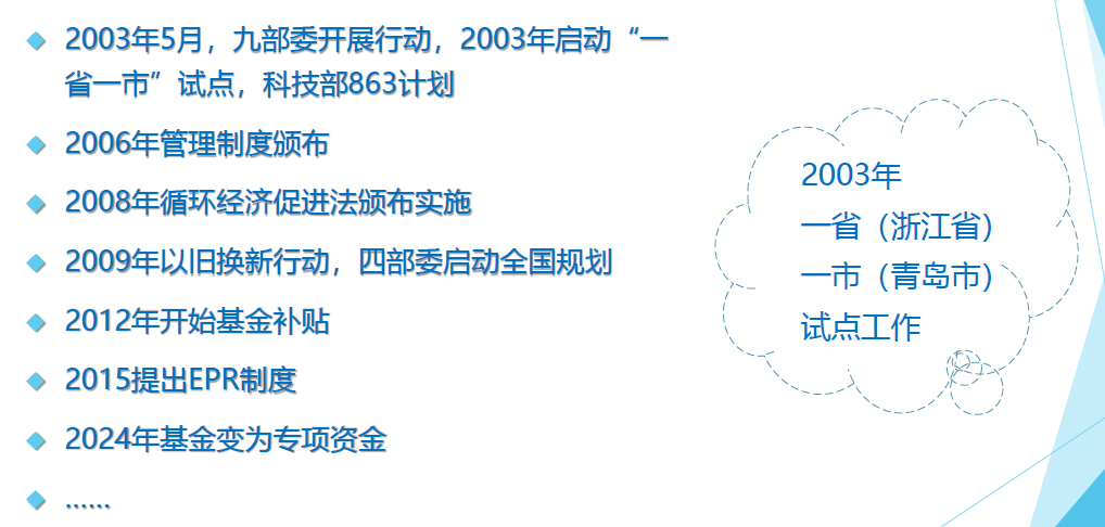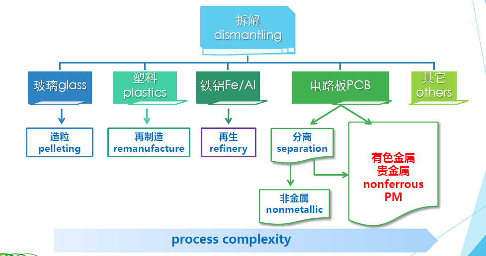 技术创新 中国加强电子废弃物处理,事关加快建设资源节约型、环境友好型社会,事关改善民生。希望推进在处理电子垃圾领域的互利合作。 政策支持 变废为宝、循环利用是朝阳产业。垃圾是放错地方的资源,把垃圾资源化,化腐朽为神奇,既是科学,也是艺术 行业现状 •管理制度日益完善; •国际形象得到扭转(广东贵屿,国际履约,UNDP项目,一带一路活动等); •109家企业,直接就业3万人,间接就业100万人; •年实际处理量由2012 年的1010 万台增长至2020 年的8498 万台; •资源效率得到保障,2012 至2020 年,拆解产物总量为1456.27 万吨; •每回收处理1 吨电子废物可减排二氧化碳4.73吨。 管理变化